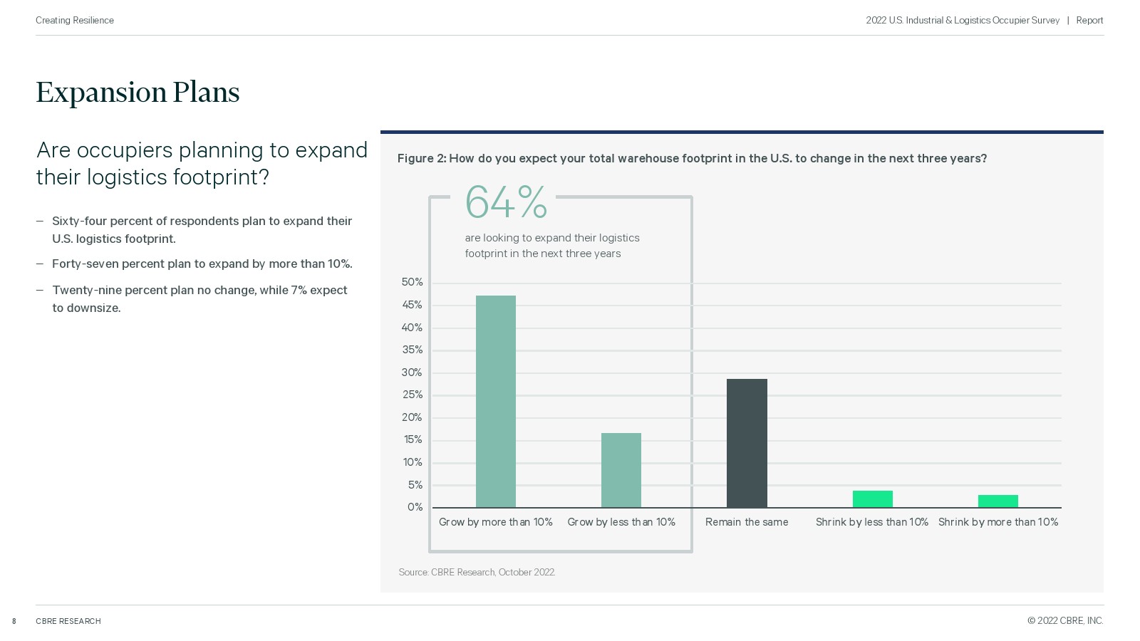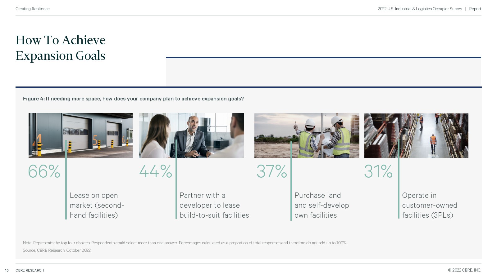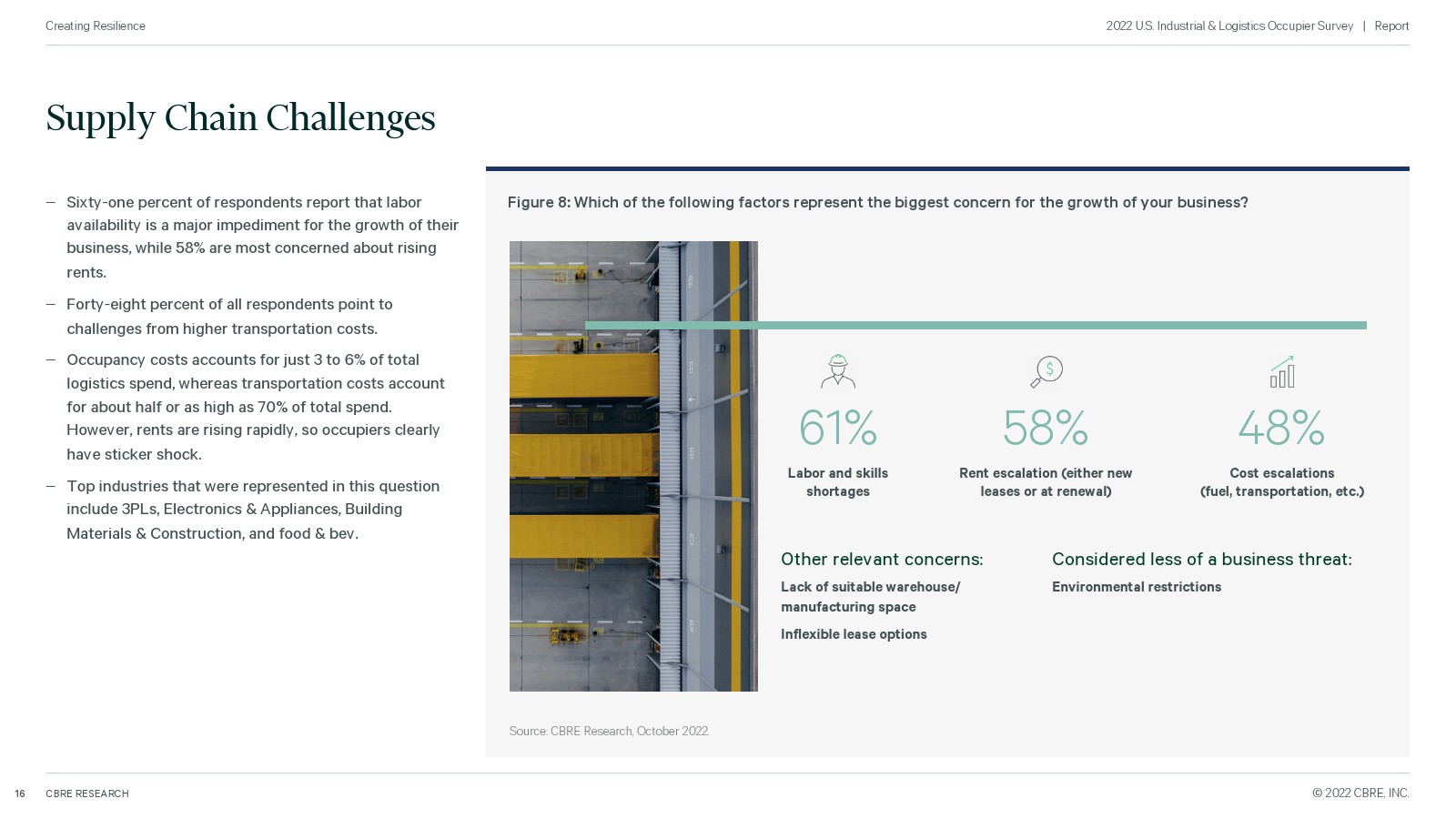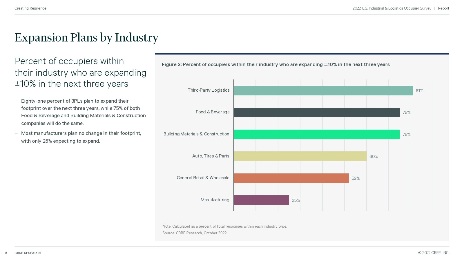 为了衡量未来的需求,世邦魏理仕对全美 100 家主要工业企业进行了调查,了解他们即将推出的计划。所有者仍在扩大他们的房地产足迹,特别是在东南部、西南和中西部,但由于供应链中断、劳动力短缺和高成本而面临挑战。