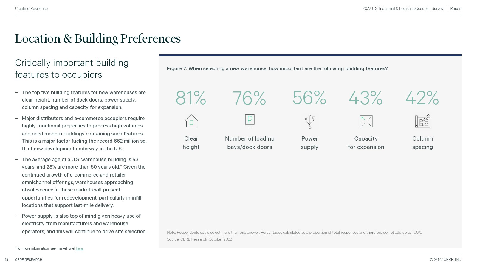 5、至关重要的建筑特征包括净高、卷帘门数量、电源、扩展能力和柱间距。