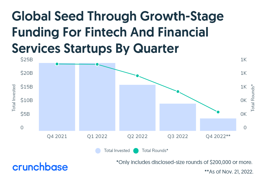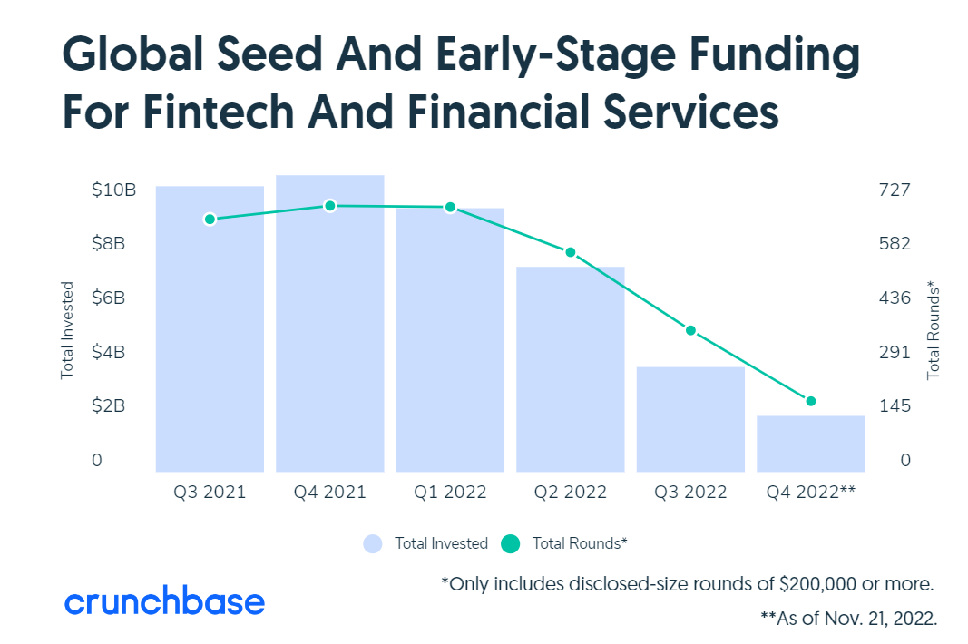 金融科技和金融服务种子和早期投资也大幅下降。下图列出了过去六个季度种子、A 轮和 B轮投资和交易数量: