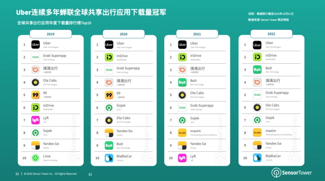 此外, Sensor Tower 称 Uber 是全球下载量最大的共享出行应用,2019 年至 2022 年稳居全球共享出行应用下载量冠军宝座。受疫情影响,Uber 下载量有所下滑,但仍远超同类竞争者。