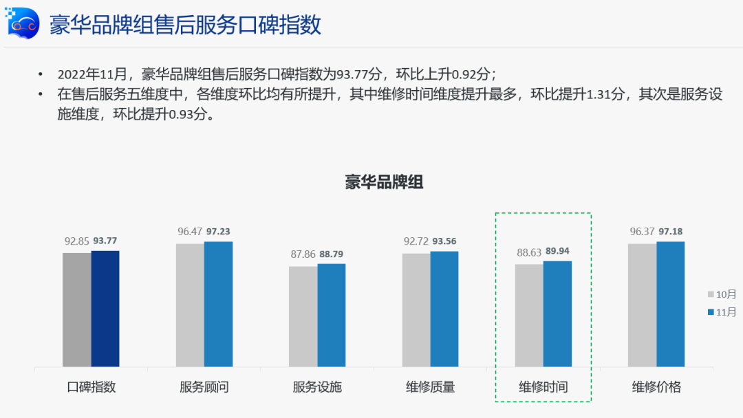 2022年11月,汽车售后服务五维度中,各维度环比均略有提升,其中“服务实施”维度提升最多,环比提升0.76分,“维修质量”维度提升最少,环比提升0.2分。