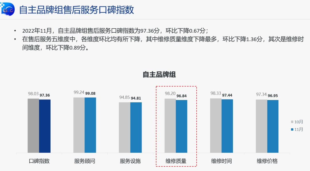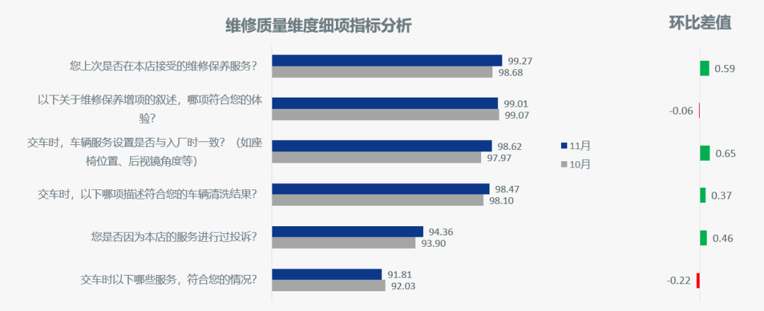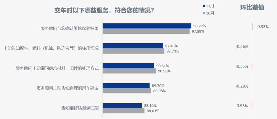 2022年11月,分析维修质量维度各细项指标发现,“交车时以下哪些服务,符合您的情况?”降低最多,环比降低0.22分。