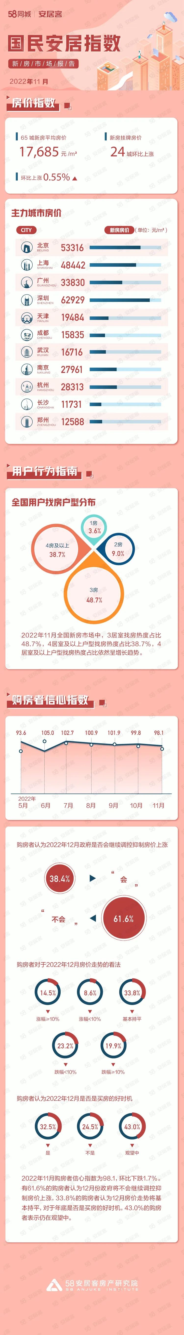 58同城、安居客发布2022年《11月国民安居指数报告》。报告显示,2022年11月,全国重点监测65城新房线上均价17685元/㎡,有24城新房价格环比上涨。65城二手房挂牌均价16630元/㎡,有20城呈现环比上涨趋势。