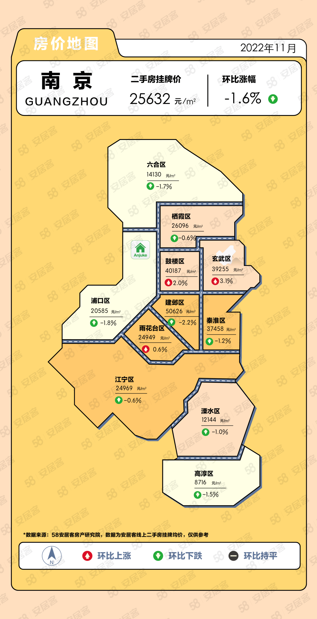 南京11月二手房挂牌价格为25632元/平方米,环比下跌1.6%,玄武、雨花台、鼓楼区域的二手房挂牌价格环比上涨。