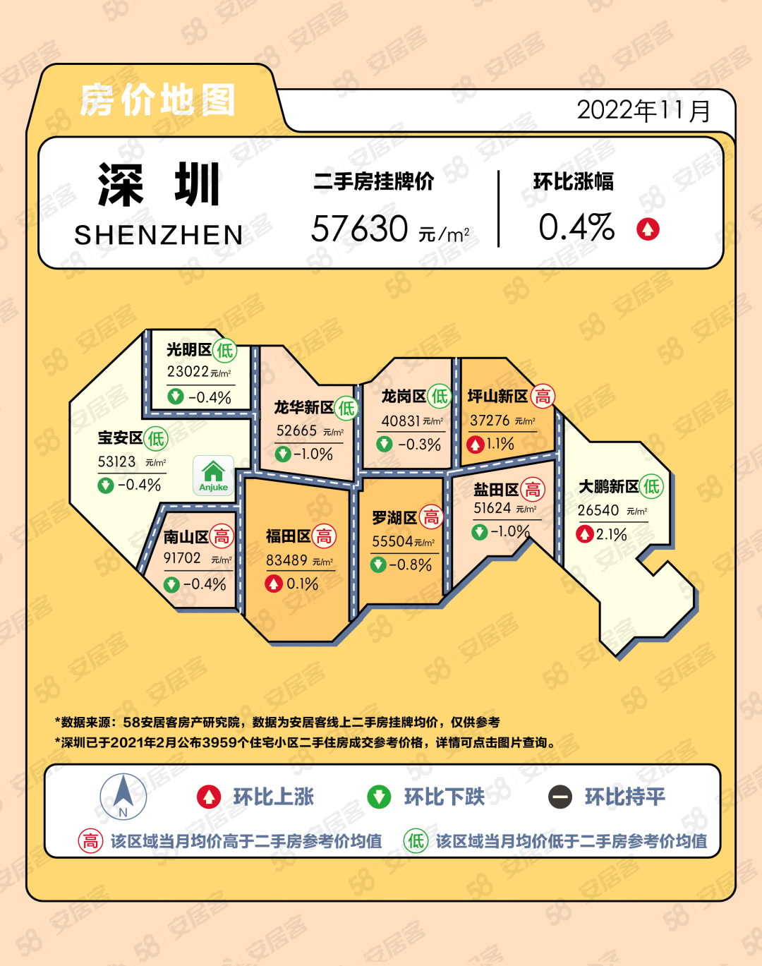 深圳11月二手房挂牌价格为57630元/平方米,环比上涨0.4%,坪山、福田、大鹏地区的二手房挂牌价格环比上行。