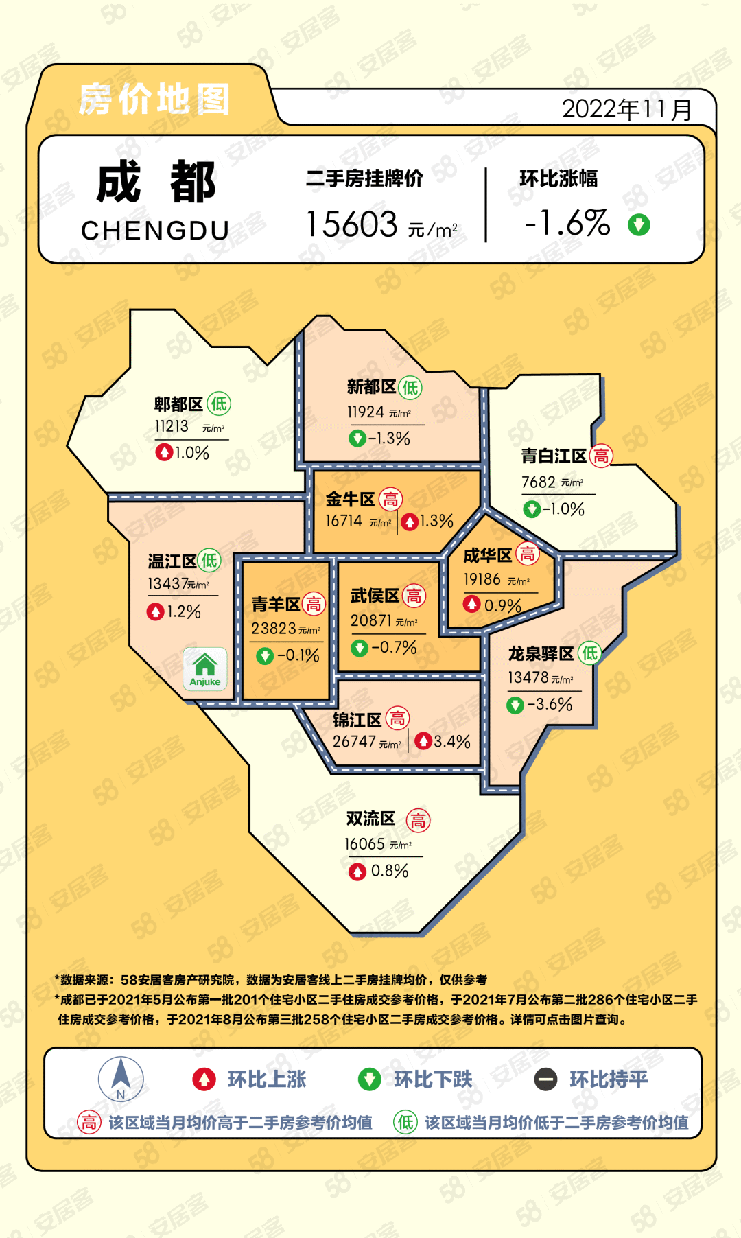 成都11月二手房挂牌价格为15603元/平方米,环比下跌1.6%,新都、武侯、青白江、青羊、龙泉驿区域二手房挂牌价格环比下跌。