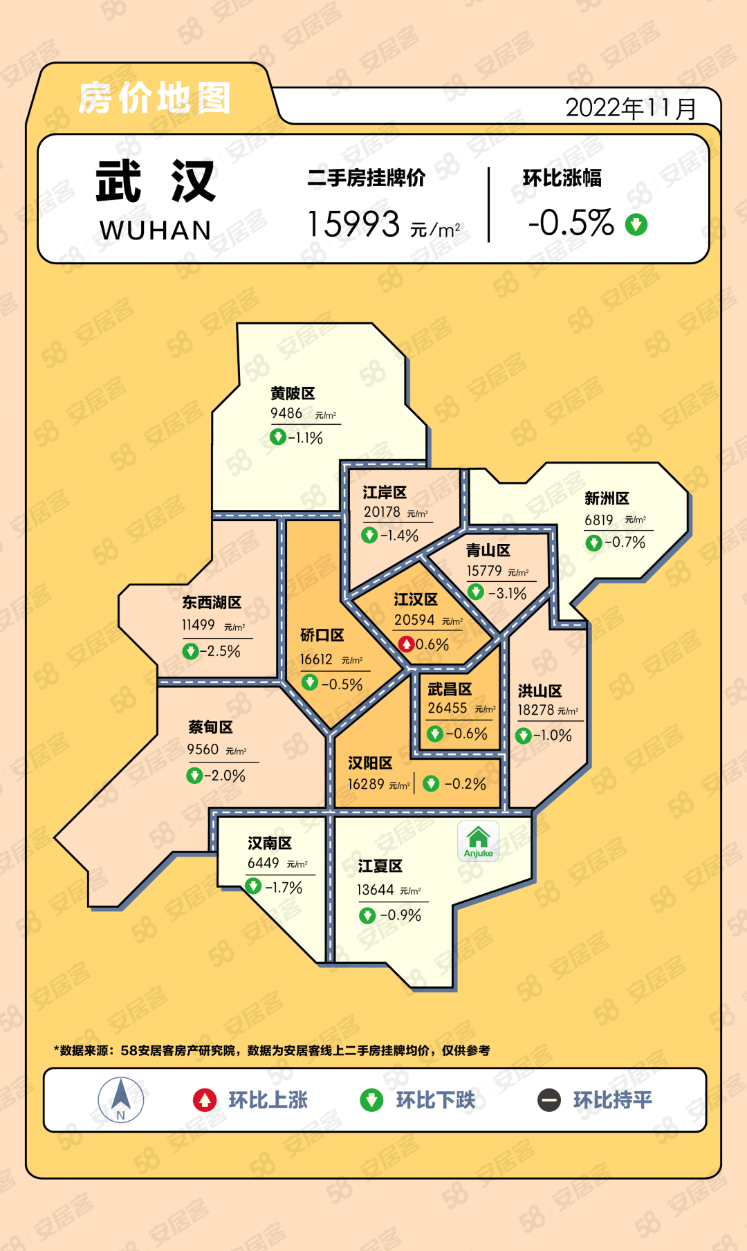 武汉11月二手房挂牌价格为15993元/平方米,环比下跌0.5%,江汉区域的二手房挂牌价格环比上涨。