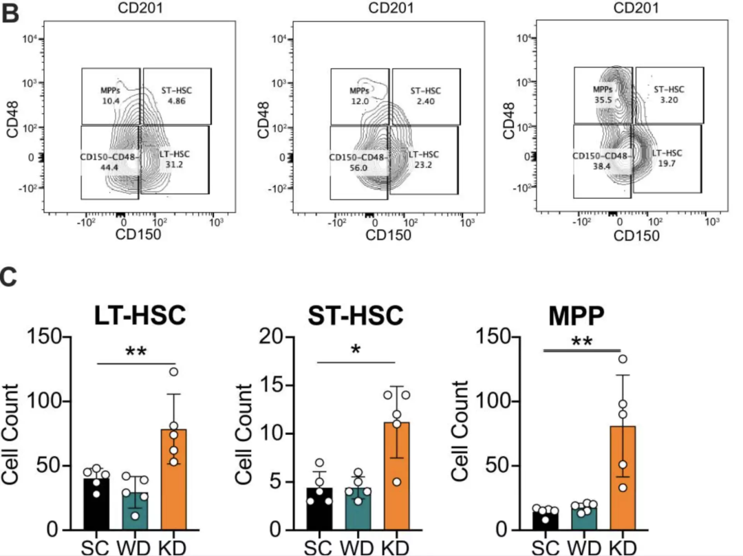 具体来说,与对照组相比,KD喂养的小鼠体内的长期、短期造血干细胞(HSC)和多能祖细胞(MPP)显著增加,而SC喂养组的MPP和粒细胞及单核细胞前体(GMP)同样得到了增强。