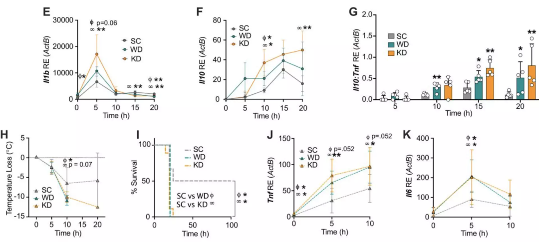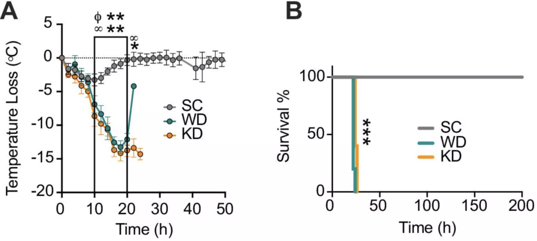 实验结果十分惊人!与对照组相比,在注射后的10小时,WD和KD喂养的小鼠表现出显著且长时间的低体温,即更严重的疾病程度。在注射后的26小时,WD和KD组表现出100%的死亡率,而与之相对的,是对照组100%的存活率!