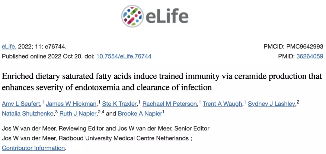 [1] Seufert AL, Hickman JW, Traxler SK, Peterson RM, Waugh TA, Lashley SJ, Shulzhenko N, Napier RJ, Napier BA. Enriched dietary saturated fatty acids induce trained immunity via ceramide production that enhances severity of endotoxemia and clearance of infection. Elife. 2022 Oct 20;11:e76744. doi: 10.7554/eLife.76744. PMID: 36264059; PMCID: PMC9642993.