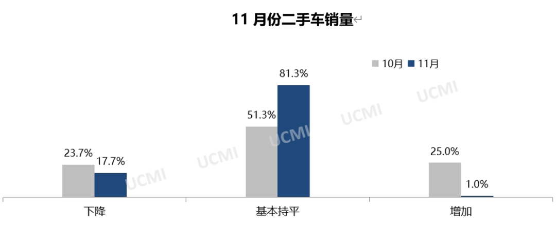 调查显示,11月份二手车交易量有所下降,认为“下降”的比例为17.7%;认为“持平”的比例为81.3%;“下降”的比例为1.0%。