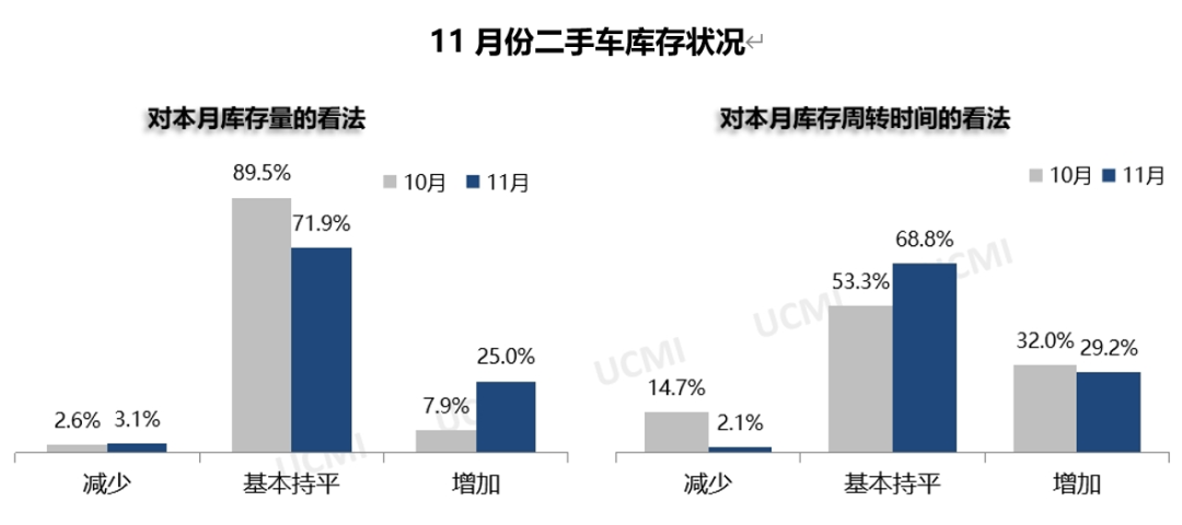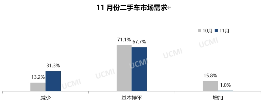 调查显示,11月份市场总需求有所减少,接受调查的二手车经理人当中认为“减少”的比例为31.3%;“增加”的比例为1.0%;“持平”的比例为67.7%。
