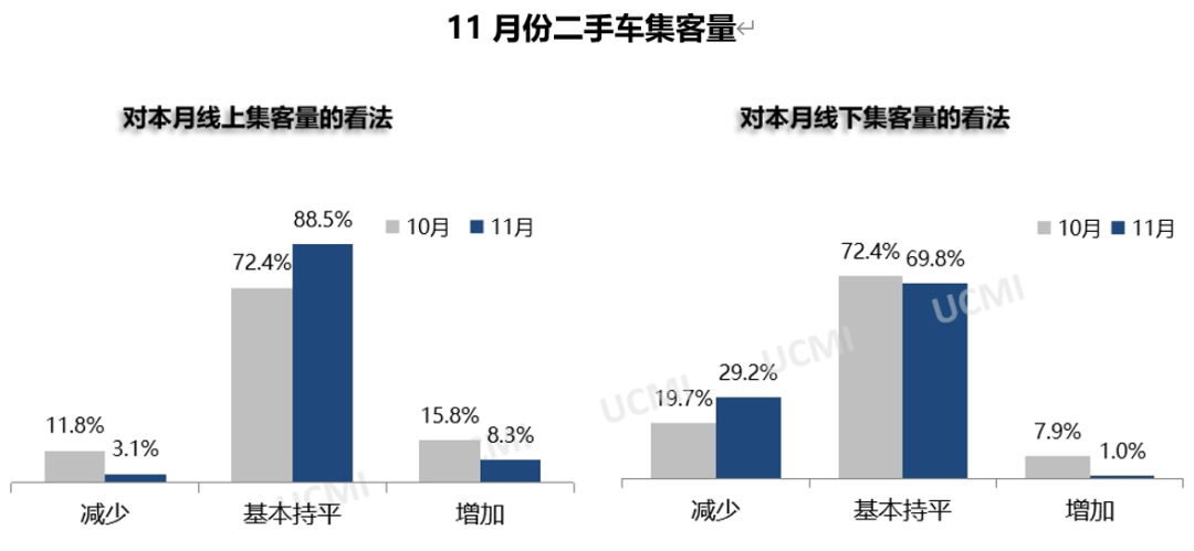 调查显示,11月份线上集客量有所增加、线下集客量有所减少。其中认为线上集客量“增加”的二手车经理人比例为8.3%;认为线下集客量“减少”的经理人比例为29.2%。