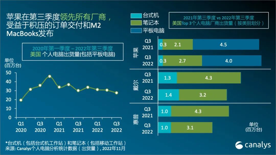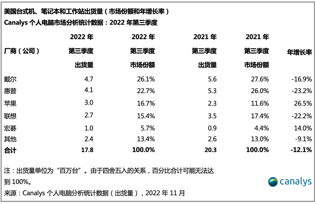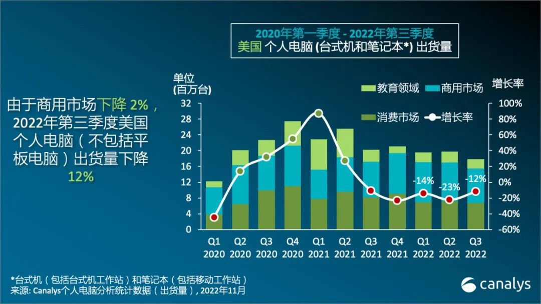 分析机构 Canalys 的最新数据显示,2022 年第三季度,美国台式机、笔记本电脑和工作站的出货量同比下降 12%,跌至 1780 万台。