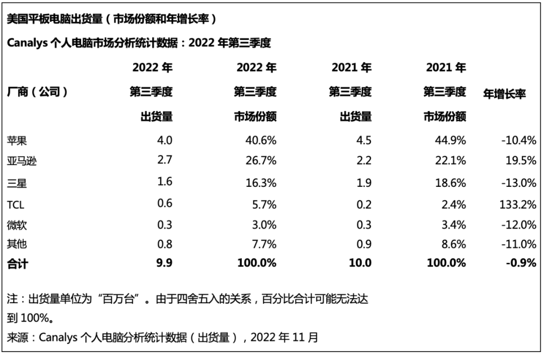 苹果以 41% 的市场份额保持了其长期以来在美国平板电脑市场的领先地位。最近几个季度,由于消费者对价格更加敏感高端平板电脑遭遇挫折,而亲民价位段的平板电脑则表现较为出色。亚马逊市场份额达到 27%,排名第二,在 7 月份成功举办的 Prime 会员日的支持下,其出货量增长了 20%。三星以 160 万台出货量位居第三,同比下降 13%。TCL 加大了在美国的营销和品牌推广力度,增长势头持续强劲,涨幅高达 133%,而微软以 12% 的跌幅跻身前五名。
