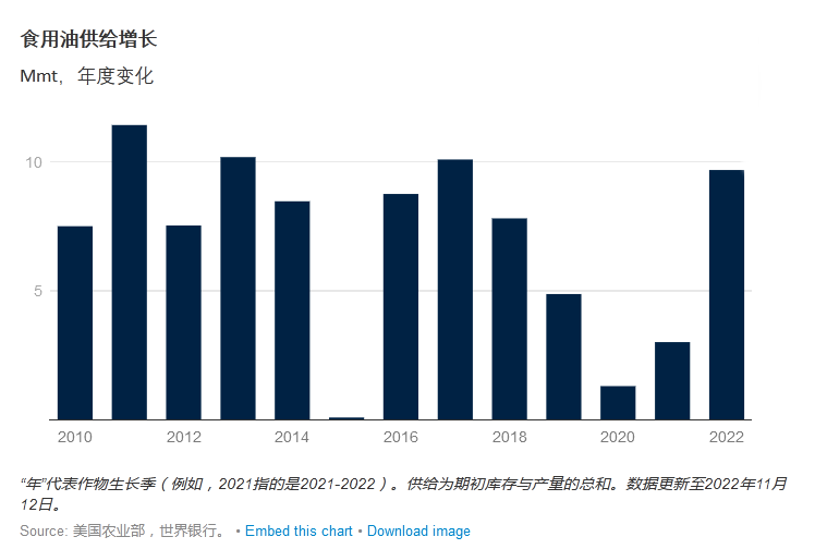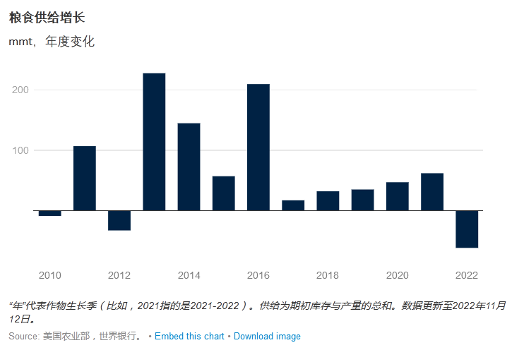 预计2022-2023年全球粮食供应将趋紧。虽然全球小麦供应量预计在8月开始的产季将略有回升,但玉米和大米的长期供应量预计将分别下降5%和2%。供应减少从中可以看出美国和欧盟(玉米)以及中国和印度(大米)的产量下降。相比之下,本季食用油供应量预计提高4%,其中很大一部分来自棕榈油、菜籽油和大豆油。