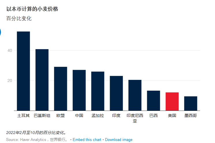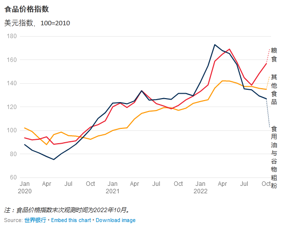许多国家的国内食品价格继续上涨。供应中断、生产成本上升和美元升值给大多数国家的国内食品价格通胀带来压力。2022年前三个季度,南亚食品价格平均上涨20%(同比);大多数其他地区平均上涨14%。东亚和太平洋地区是个例外,该地区的食品价格平均仅上涨6%,部分原因是该地区的主食大米价格保持稳定。