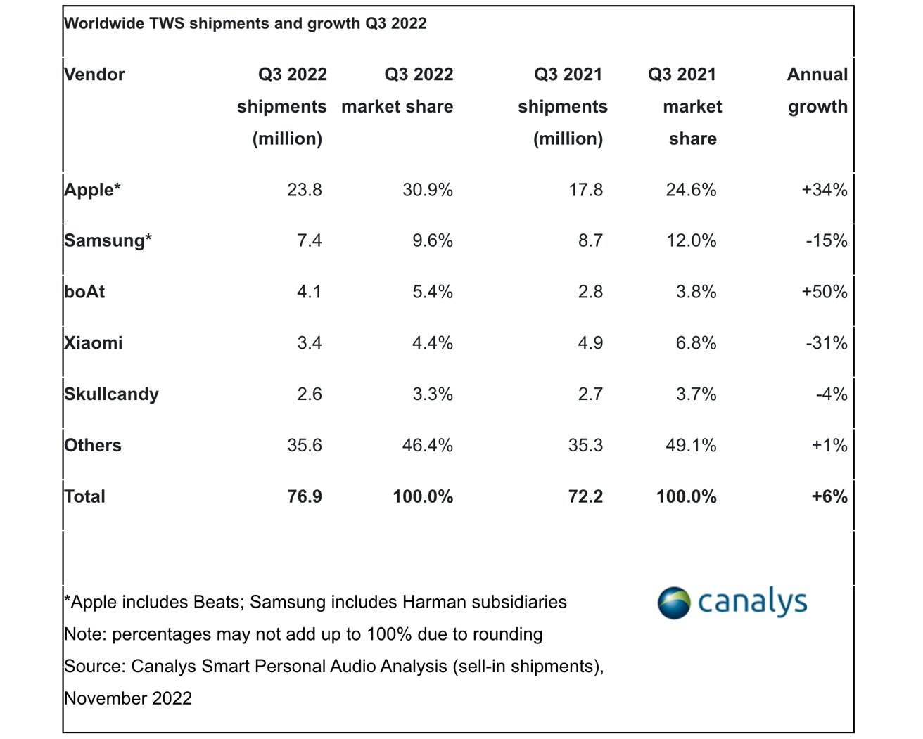 根据Canalys的数据,全球智能个人音响市场在2022年第三季度连续第二个季度出现下滑,出货量同比下降4%,至1.136亿台。然而,TWS是唯一出现增长的子类别,同比增长6%,总数达到7690万台。