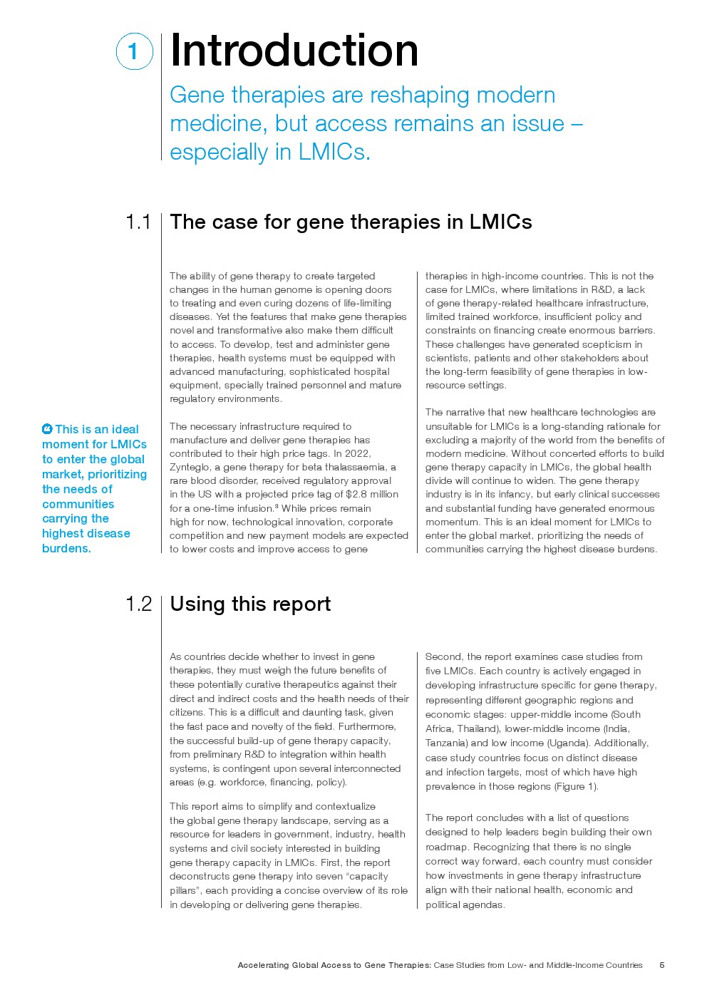 为了解阻碍中低收入国家进入全球基因治疗市场的独特障碍,本报告调查了五个中低收入国家(乌干达、坦桑尼亚、南非、泰国和印度),它们正在积极寻求针对广泛疾病(HIV、HBV、 镰状细胞病、β 地中海贫血、血友病和某些癌症)的基因疗法。