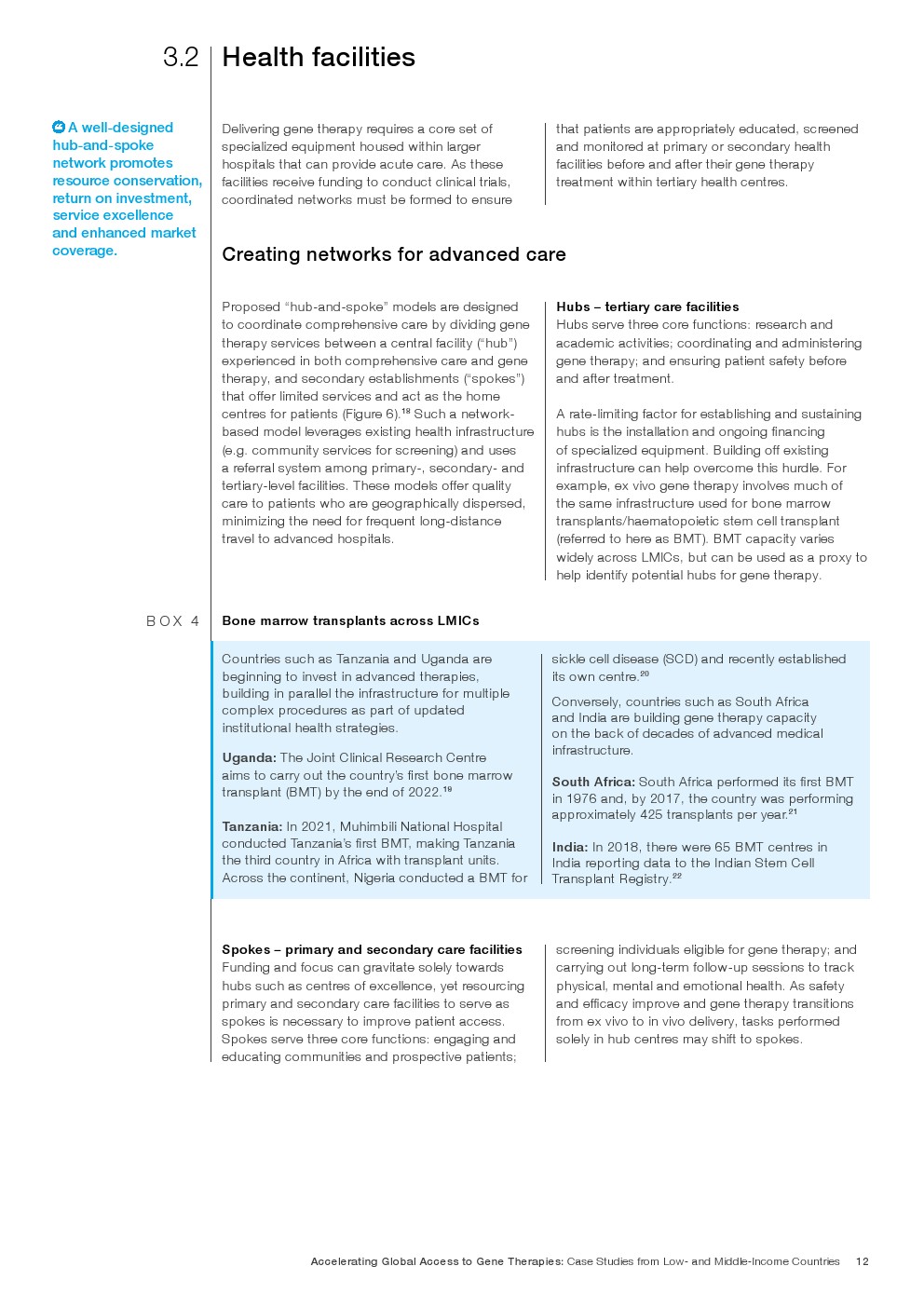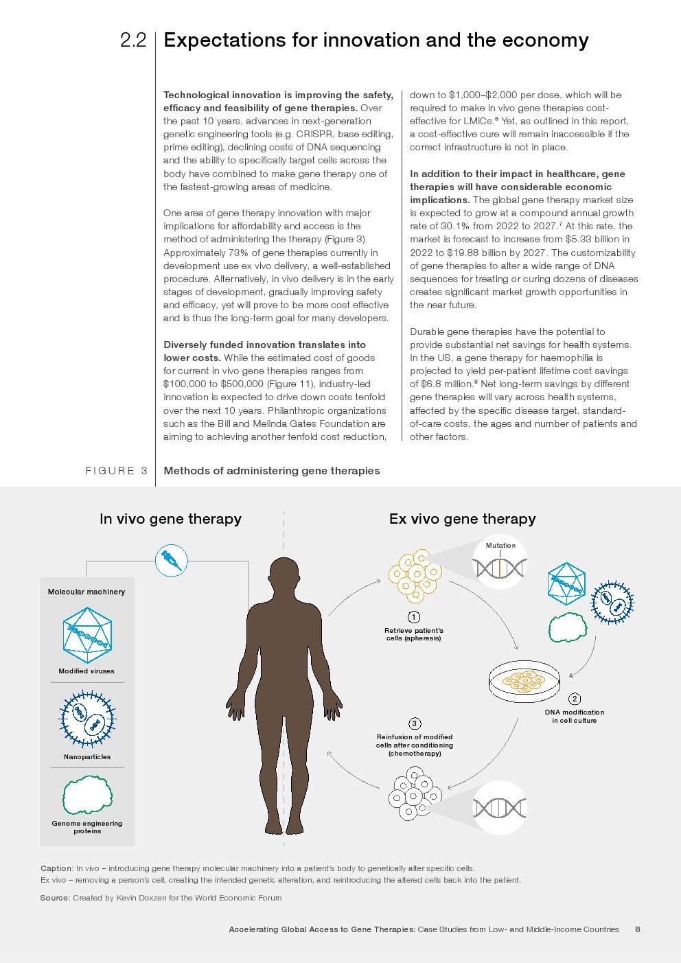 世界经济论坛发布了新报告“加速全球获得基因疗法——来自中低收入国家的案例研究”。基因疗法处于现代医学的前沿。 通过对人类基因组进行精确的改变有可能一次性治愈各种顽疾。 截至 2022 年年中,全球有 2000 多种基因疗法正在开发中,预计到 2027 年全球市场价值将达到近 200 亿美元。研究人员正在将基因疗法应用于影响着全球数以千万计的人的传染病和非传染性疾病(例如 HIV、 镰状细胞病),其中大多数生活在低收入和中等收入国家(LMIC)。