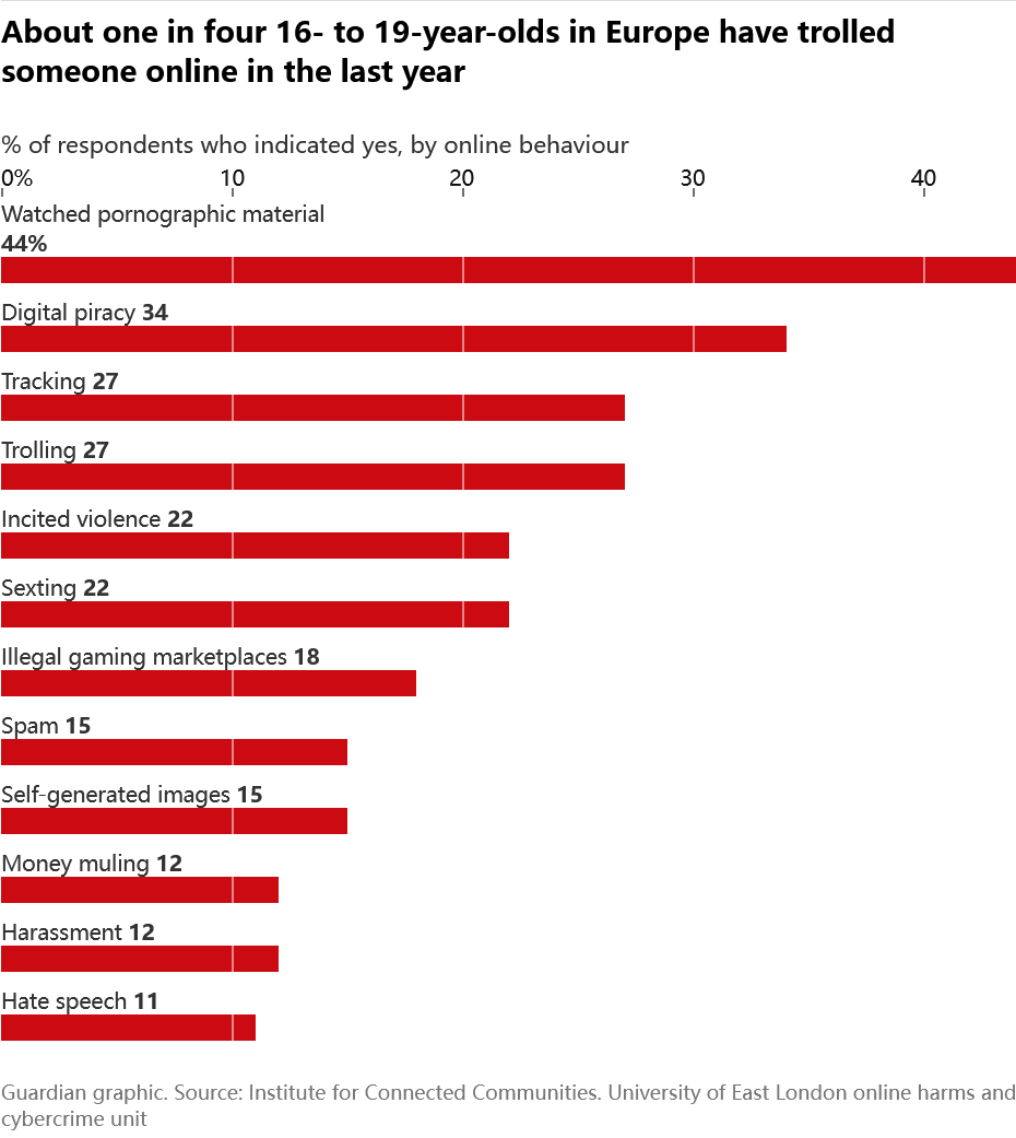 对8000名年轻人的调查发现,四分之一的人曾在网上跟踪或嘲弄别人,八分之一的人曾参与网上骚扰,十分之一的人曾参与仇恨言论或黑客行为,五分之一的人曾发送色情短信,三分之一的人曾参与数字盗版。调查还发现,每10人中有4人观看过色情制品。