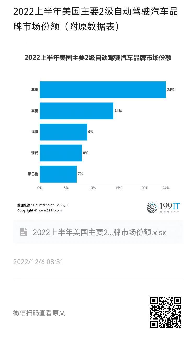 2022上半年美国主要2级自动驾驶汽车品牌市场份额(附原数据表) 更多阅读:浅谈L3、L4级自动驾驶上路将全国试点北京智能车联:2020年北京市自动驾驶车辆道路测试报告清华大学&百度:面向自动驾驶的车路协同关键技术与展望加州车管所: 2019 年年度自动驾驶接管报告华为:自动驾驶网络解决方案白皮书自动驾驶出租车到底“破坏力”几何?当自动驾驶还未摆脱人类路透:调查显示三分之二美国人不信任自动驾驶汽车德勤咨询:汽车技术前沿调查自动驾驶困境:如何跨越人类与机器的鸿沟?自动驾驶系统2.0:安全展望奔向2025:自动驾驶潜在消费者报告面对自动驾驶的未来,Uber和Lyft何去何从?自动驾驶车科技研发 福特领先同业CES智能汽车领域深度分析一:自动驾驶催生商业模式变革