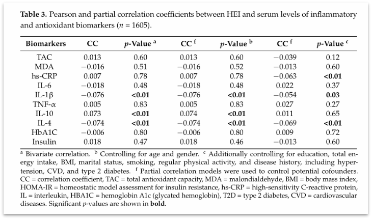 随着研究的深入,研究者探究了HEI与炎症和氧化应激标志物之间的相关性(表3)。发现在双变量和部分相关模型中,HEI与IL-4(白细胞介素-4)呈现显著的负相关关系。在多变量校正模型中,HEI与IL-1β(白细胞介素-1β)和hs-CRP(高灵敏度C反应蛋白)之间存在显著的负相关。而与氧化应激的标志物TAC(总抗氧化能力)和MDA(丙二醛)之间的相关性不显著。这一发现支持了我们的假设,即更好的健康饮食模式可以通过减少慢性低度炎症来促进健康相关效果。