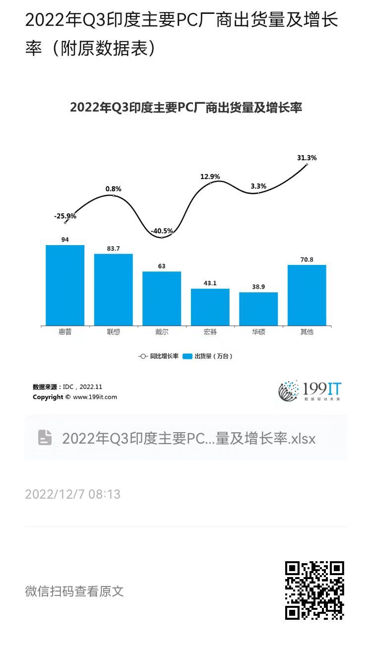 2022年Q3印度主要PC厂商出货量及增长率(附原数据表) ​​​​