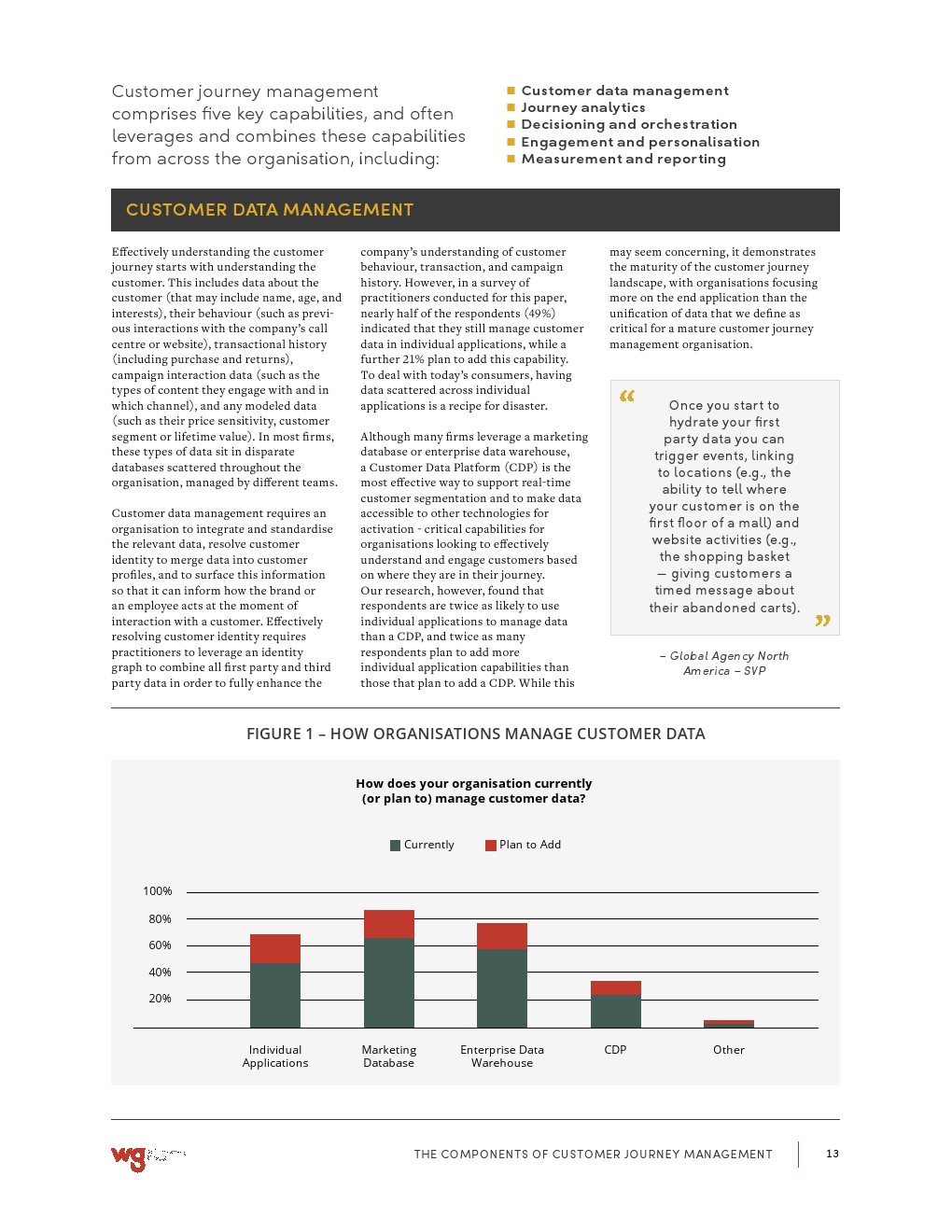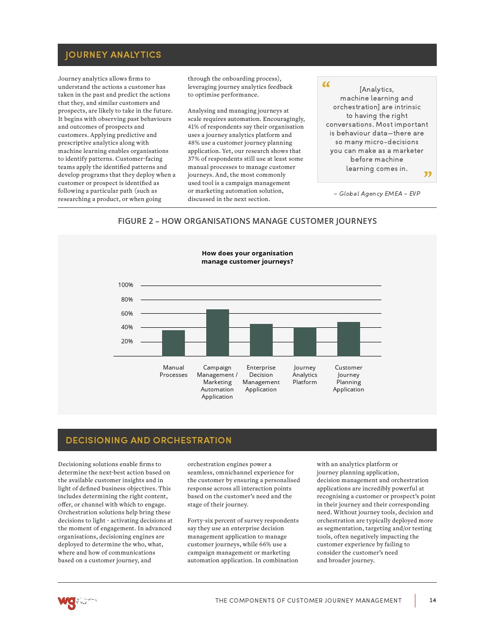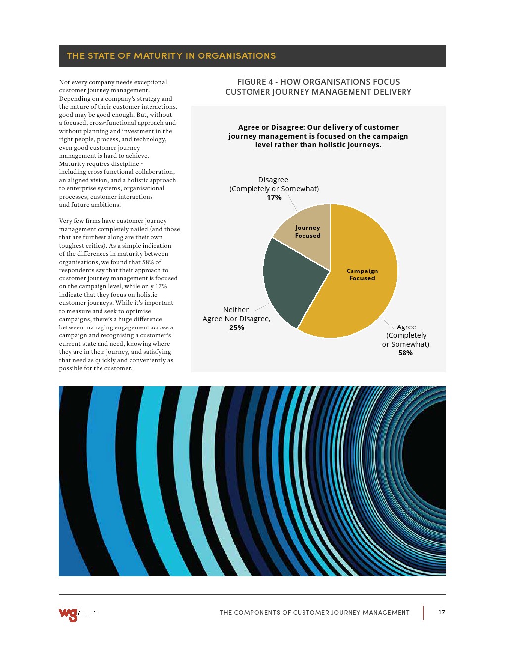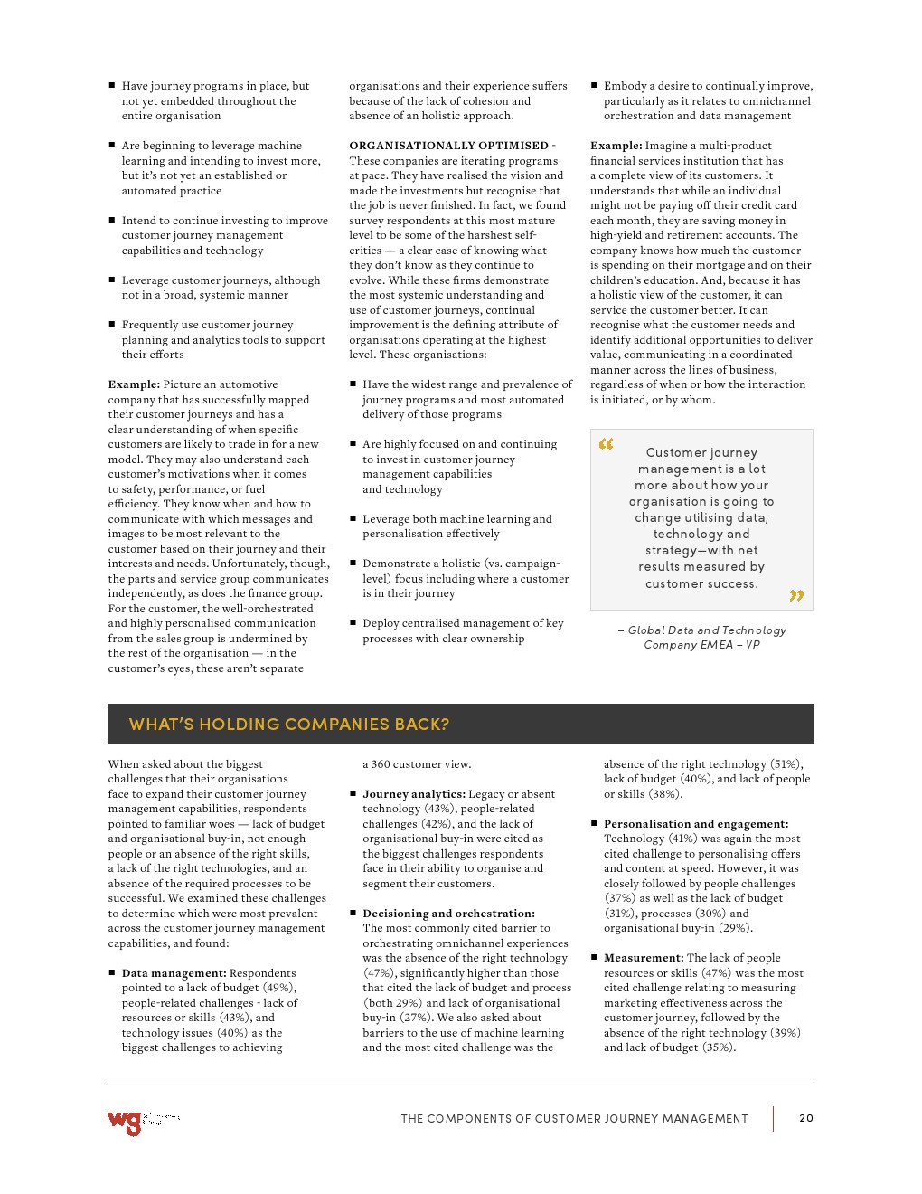 这项研究旨在了解美国和英国企业中客户旅程管理的普遍性和成熟度。 报告分析了公司在客户数据管理、旅程分析、决策和编排、参与和个性化以及测量方面所采用的方法。调查发现,由于缺乏高层支持、技能和资源、预算、技术,或依赖遗留技术等障碍,大多数公司都在努力取得挣扎。与此同时,大多数企业仍然采用营销活动而非以客户为导向的方法:58%的受访者表示他们的客户旅程管理方法侧重于营销活动层面;只有 17%的受访者表示他们专注于整体客户旅程。