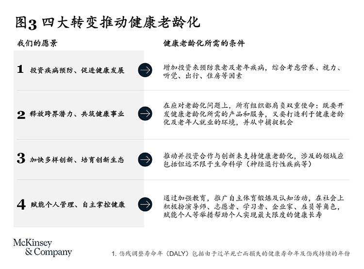 人口结构老龄化的挑战切实存在,但我们也不应过于消极,忽视了伴随社会形态变化而蕴含的种种机遇。麦肯锡健康促进研究院认为,落实四大转变可以重新定义一个全面健康的老龄化社会: