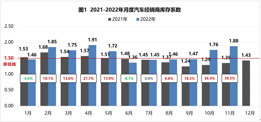 2022年12月10日,中国汽车流通协会发布2022年11月份“汽车经销商库存”调查结果:11月份汽车经销商综合库存系数为1.88,环比上升6.8%,同比上升39.3%,库存水平位于警戒线以上。