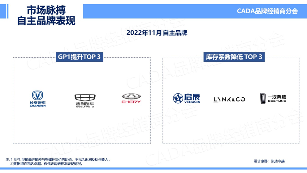 2022年11月,自主品牌中GP1提升最优的三个品牌为:长安乘用车、吉利、奇瑞;库存系数降低的前三个品牌为:启辰、领克、奔腾。
