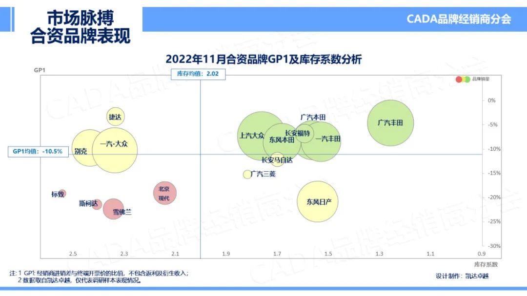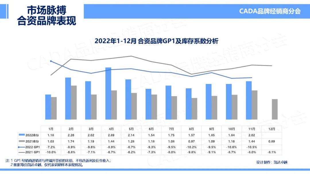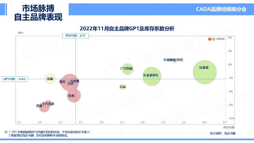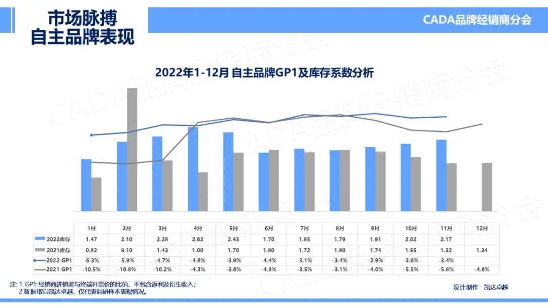 2022年1-11月,自主品牌销量继续保持增长态势,表现出了较强的市场适应性和竞争实力。而新能源购置税补贴政策即将随2022年一起过去,自主品牌新能源市场在2023年即将迎来市场的考验。11月份,自主品牌库存系数升至2.17,GP1为-3.4%,与上月相比有所上升。