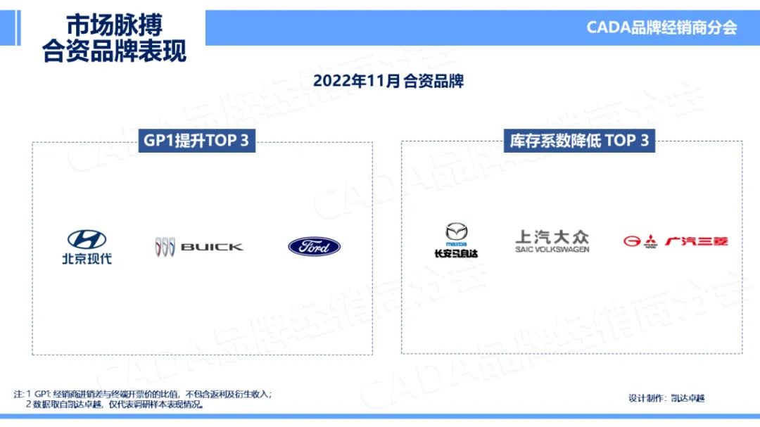 本月合资品牌表现中, GP1提升TOP3品牌分别为:北京现代、别克、长安福特;库存系数降低排名前三的品牌是:长安马自达、上汽大众、三菱。