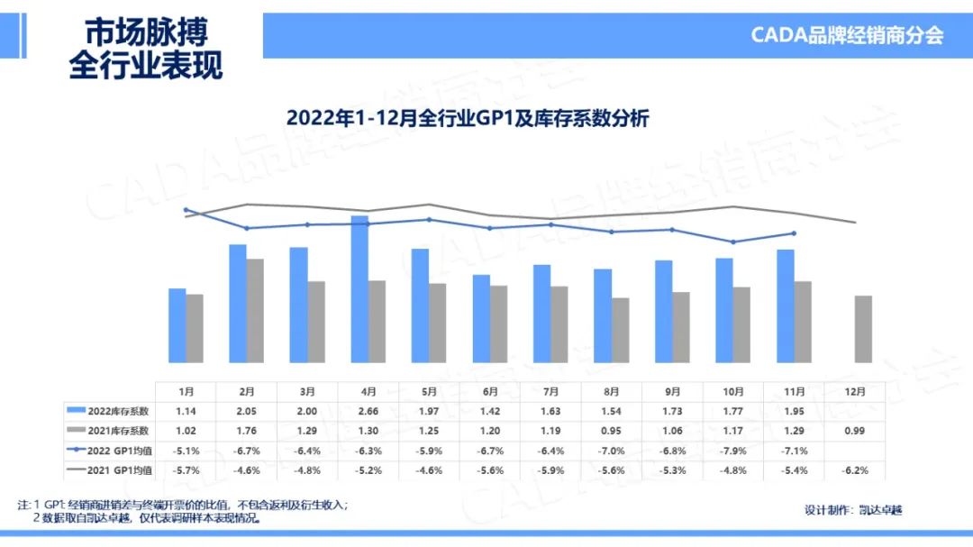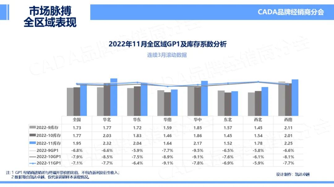 11月,新冠疫情在全国各地反扑明显,各地份纷纷加码疫情防控。经销商闭店频率明显增加。全国及各区域市场稳定增长,GP1小幅上升至-7.1%,库存系数受局部地区疫情封控影响回升到1.95。分区域来看,华南区域GP1最低,西南区域的库存系数最高。