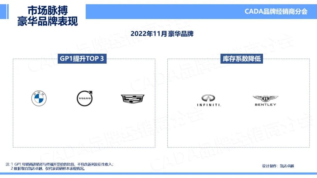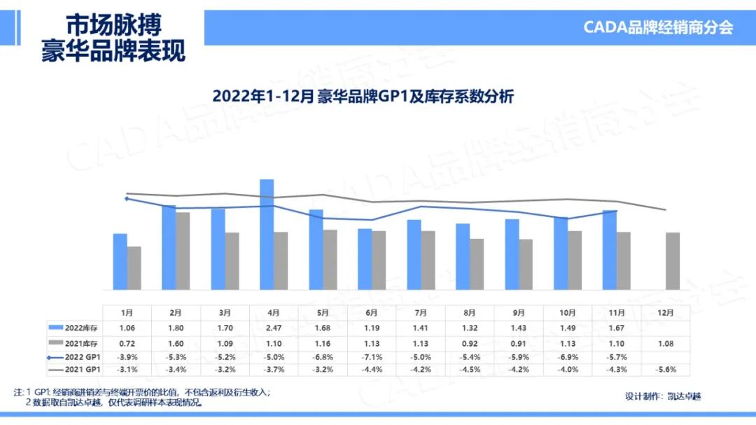 2022年11月,各地防疫管控力度大,消费者进店明显降低,特别是北京、广州等大型城市接连收紧防疫管控措施,减少人员流动;对豪华品牌销售更是雪上加霜。豪华品牌库存系数上升至1.67;GP1指标为-5.7%,与上月相比小幅上升。