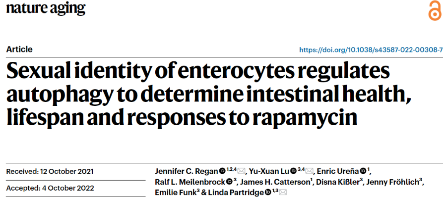 进一步实验发现,雌性果蝇肠道的细胞自噬水平相对雄性来说较低,利用RNA干扰手段降低雌性果蝇肠道中的细胞自噬水平,发现对其肠道健康和寿命没任何影响。但是以相同手段降低雄性的细胞自噬水平会导致其肠道肿瘤增加和寿命缩短。表明雌雄两性肠道中不同的细胞自噬水平很有可能调控果蝇的健康和寿命。