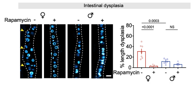 而雷帕霉素能有效地降低老年雌性果蝇的肠道肿瘤发生率,使其达到没有喂食雷帕霉素的老年雄性果蝇的水平。可是,雷帕霉素并不能改善原来就比较健康的老年雄性肠道。
