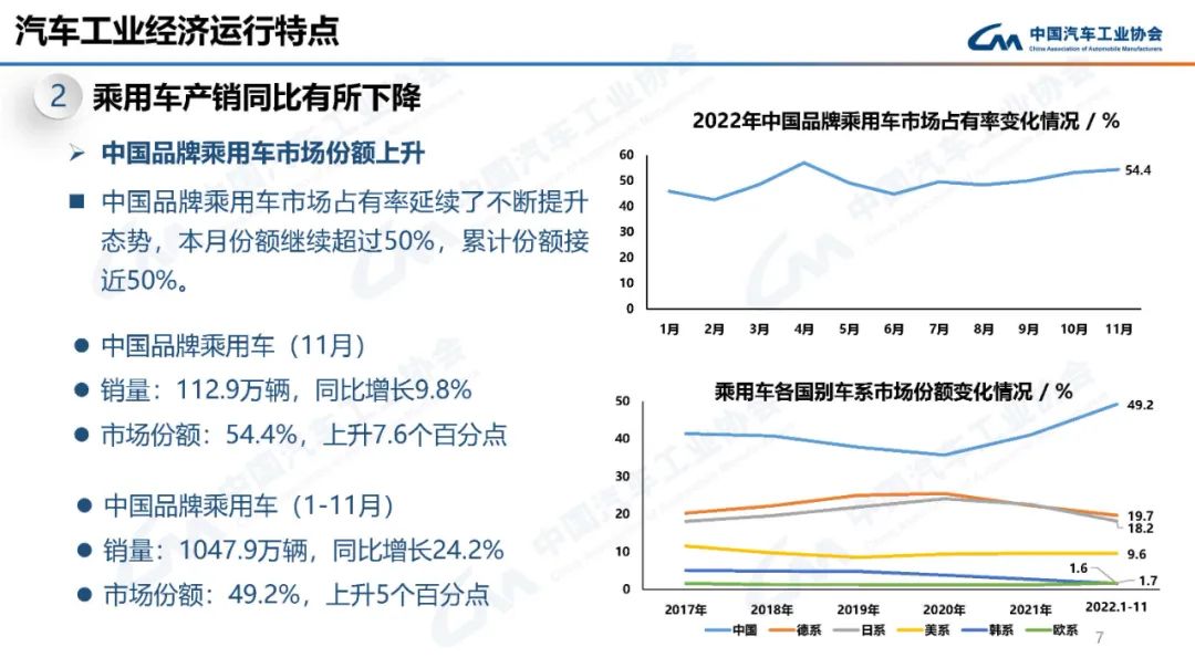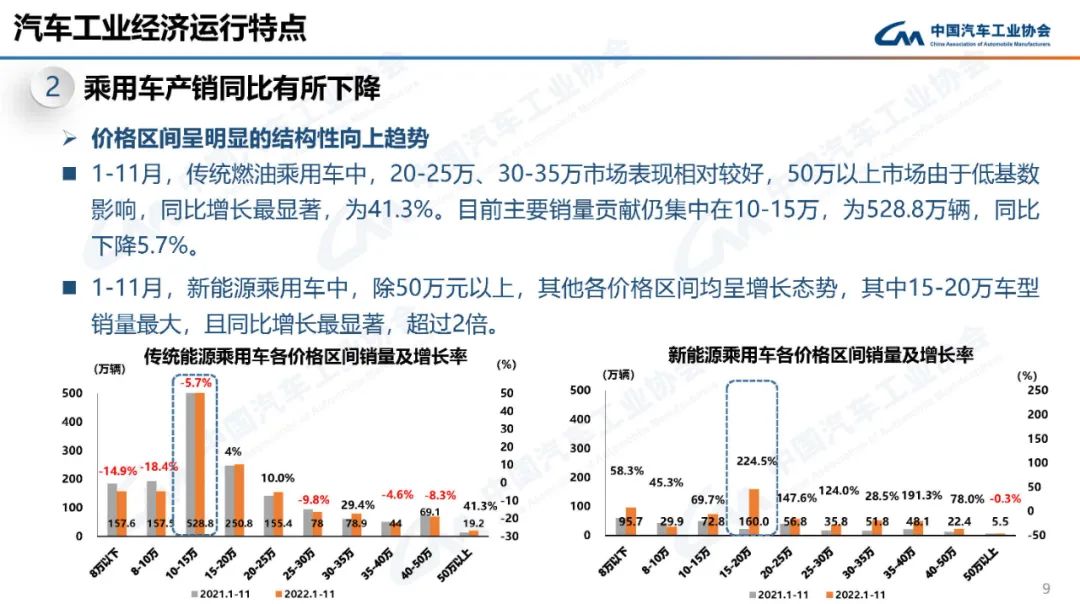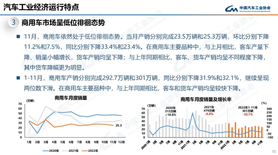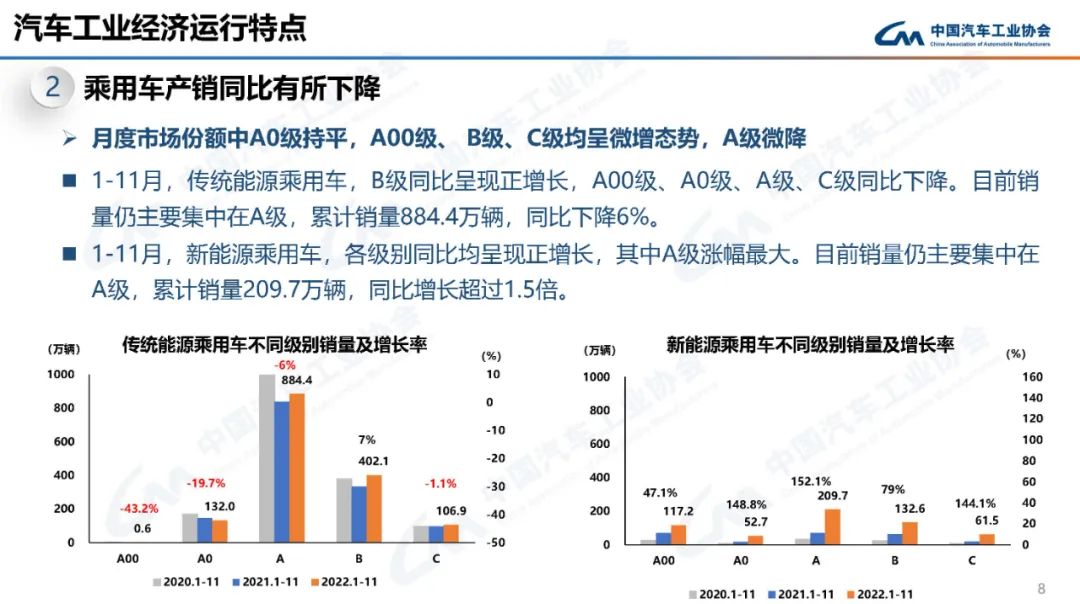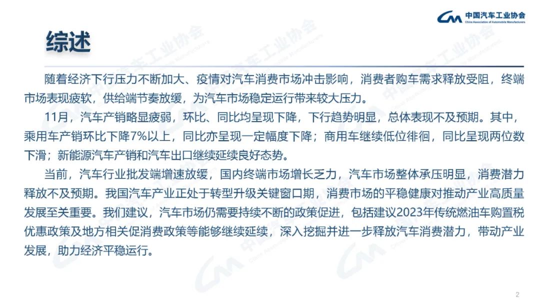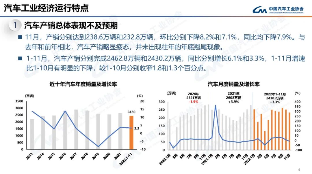 中国汽车工业协会:2022年11月汽车工业产销情况 据中国汽车工业协会统计分析,2022年11月,汽车产销略显疲弱,环比、同比均呈现下降,下行趋势明显,总体表现不及预期。 更多阅读:中国汽车工业协会: 2023年5月汽车工业产销情况中国汽车工业协会:2023年3月汽车工业产销情况中国汽车工业协会:2023年7月汽车工业产销情况中国汽车工业协会:2022年汽车工业产销情况中国汽车工业协会:2023年8月汽车工业产销情况中国汽车工业协会:2023年1月汽车工业产销情况中国汽车工业协会:2024年6月汽车工业产销情况中国汽车工业协会:2022年10月中国汽车工业经济运行情况中国汽车工业协会:2024年10月汽车工业产销情况中国汽车工业协会:2021年9月中国汽车工业经济运行情况中国汽车工业协会:2020年11月汽车工业经济运行情况中国汽车工业协会:2023年6月汽车工业产销情况中国汽车工业协会:2021年2月中国汽车工业经济运行情况中国汽车工业协会:2023年2月汽车工业产销情况中国汽车工业协会:2023年1月汽车工业产销情况简析