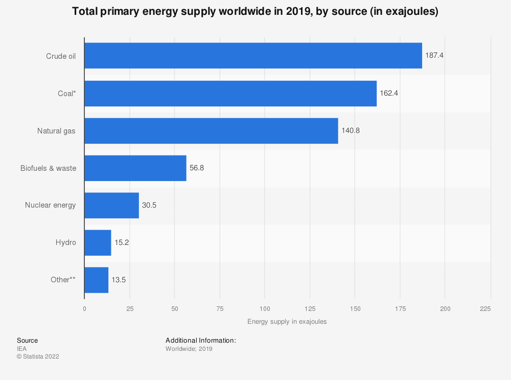 原油是供应最多的一次能源。每年生产和销售约187.4艾焦耳。石油是汽油和柴油等汽车燃料的主要原料,也是塑料和药品等石化产品的基本成分。全球原油储量约为1.7万亿桶。煤炭是第二大消耗的一次能源燃料。煤炭消费在很大程度上是由电力需求驱动的,因为它仍然是全球发电的主要来源。尽管这一数字自1965年以来下降了约10%,但化石燃料在能源消费中的份额仍保持在83%以上。