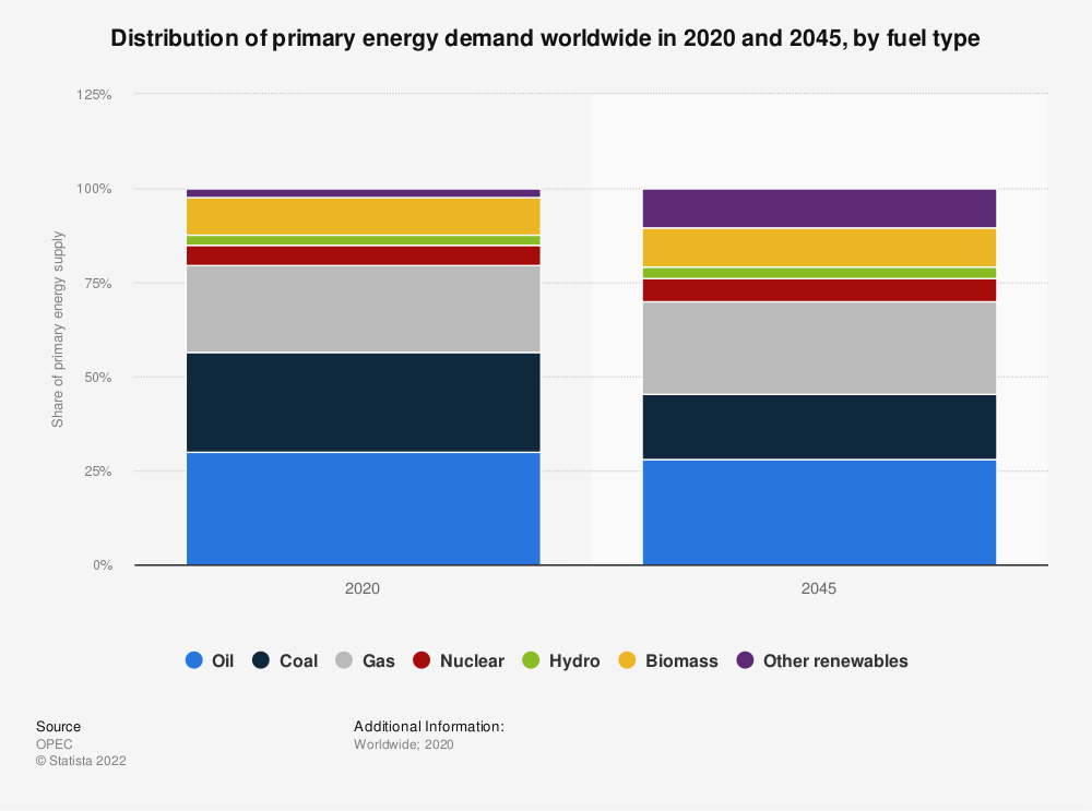 石油在全球一次能源需求中所占份额最大。到2020年,石油在一次能源总需求中的份额为30%。然而,这一数字预计将在未来几年下降,到2045年降至28.1%左右,届时将更加重视可再生能源的部署。