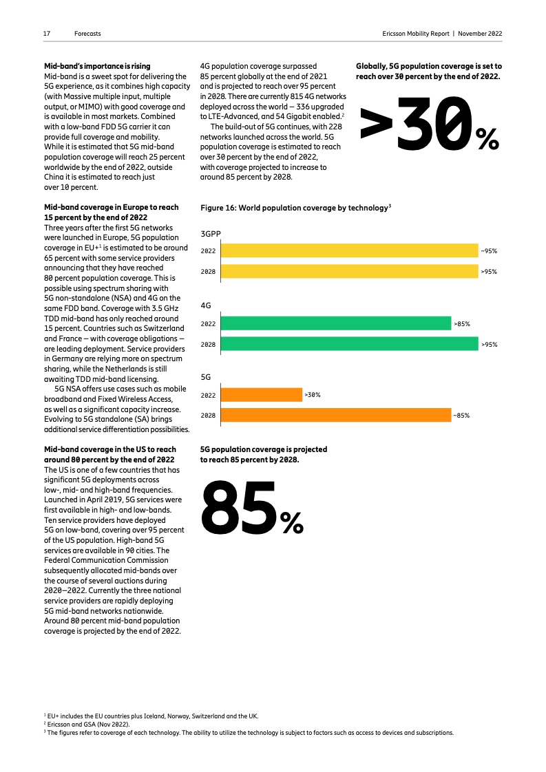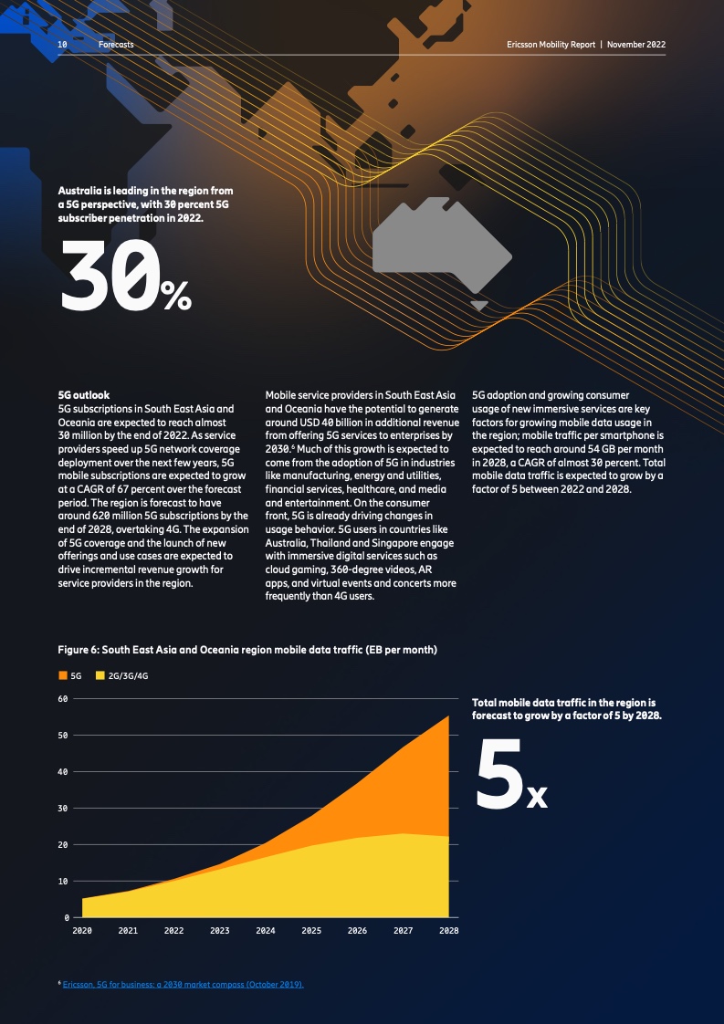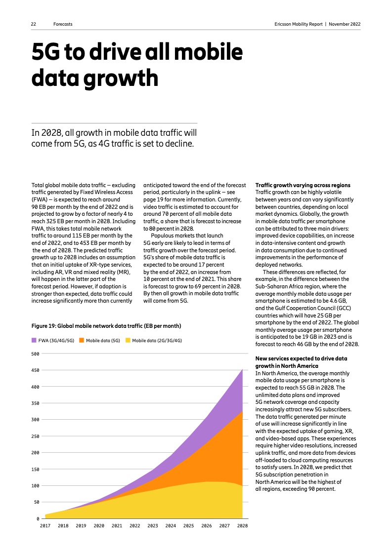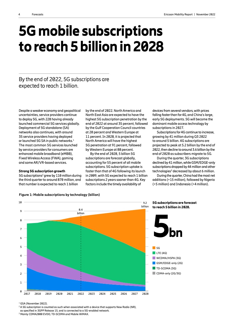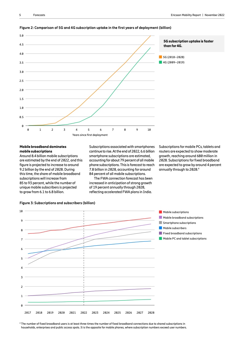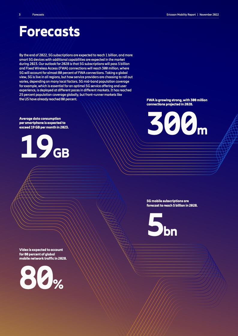 到 2022 年底,全球5G 用户预计将达到 10 亿人。2023 年市场将推出更多具有附加功能的智能 5G 设备。对 2028 年的展望是 5G 用户将超过 50 亿人,固定无线接入(FWA)连接数将达到 3 亿个,其中 5G 将占 FWA 连接的近 80%。