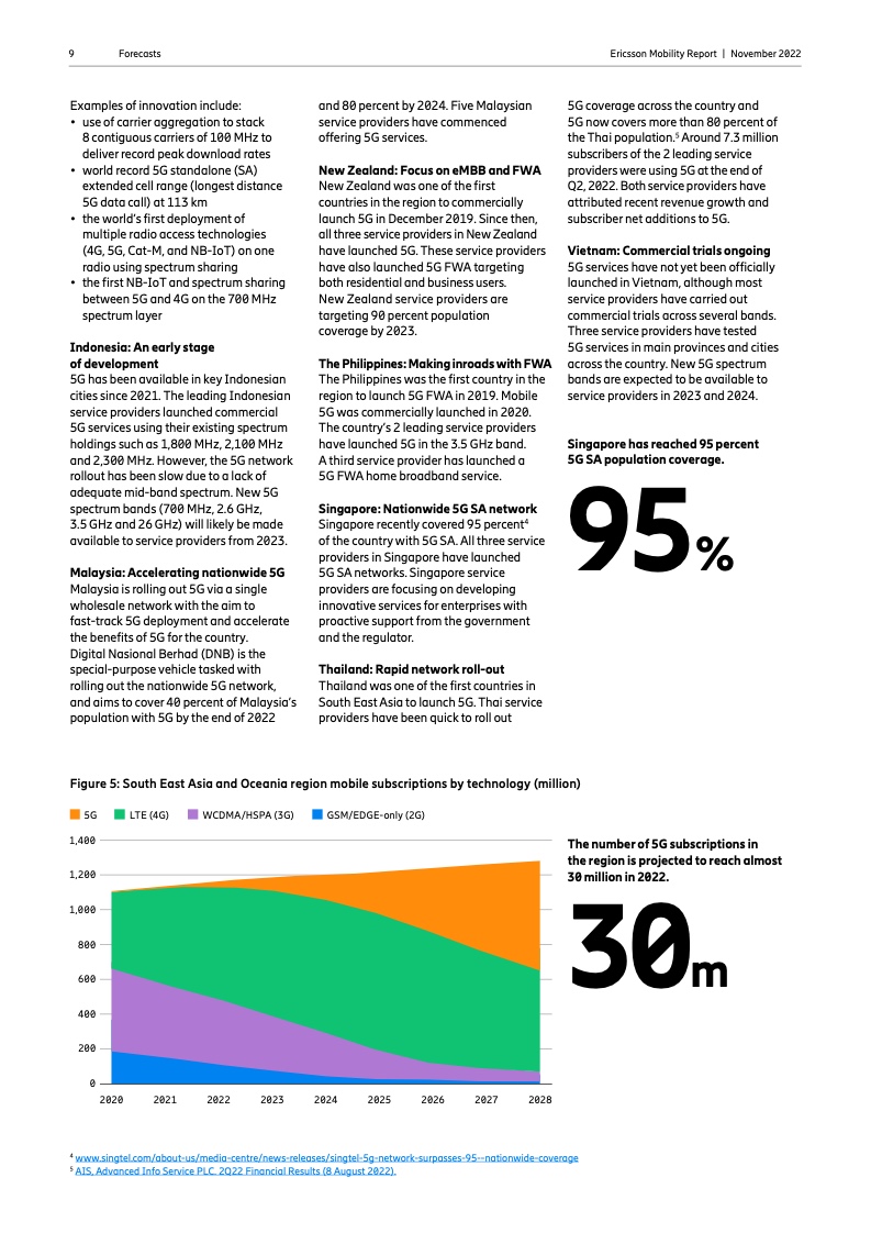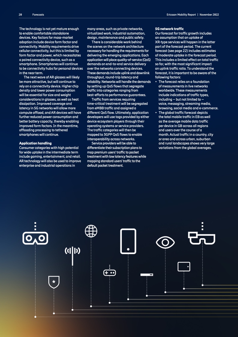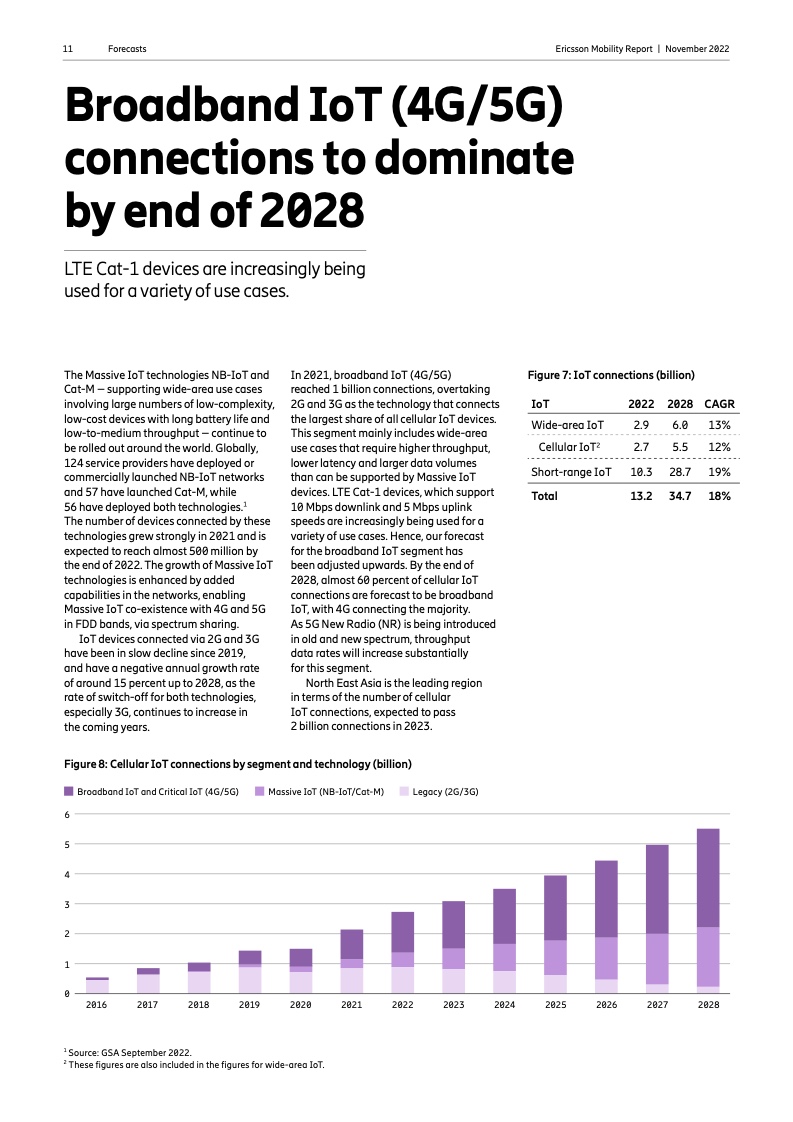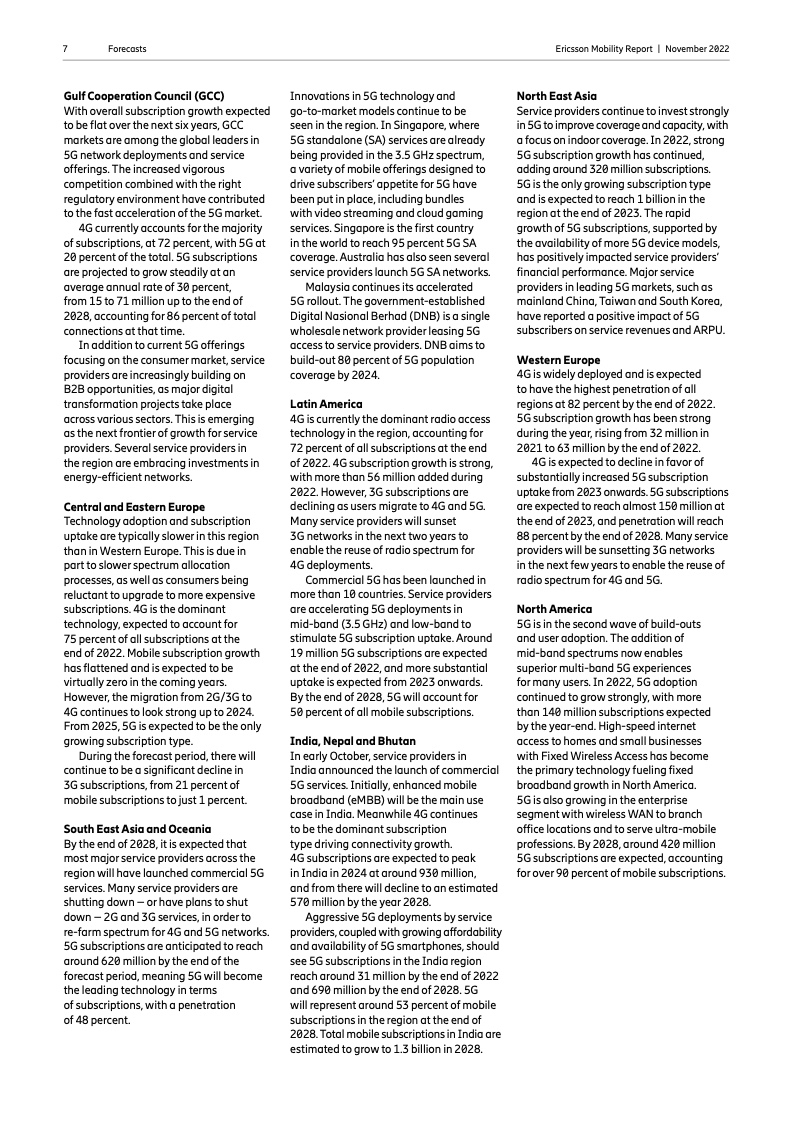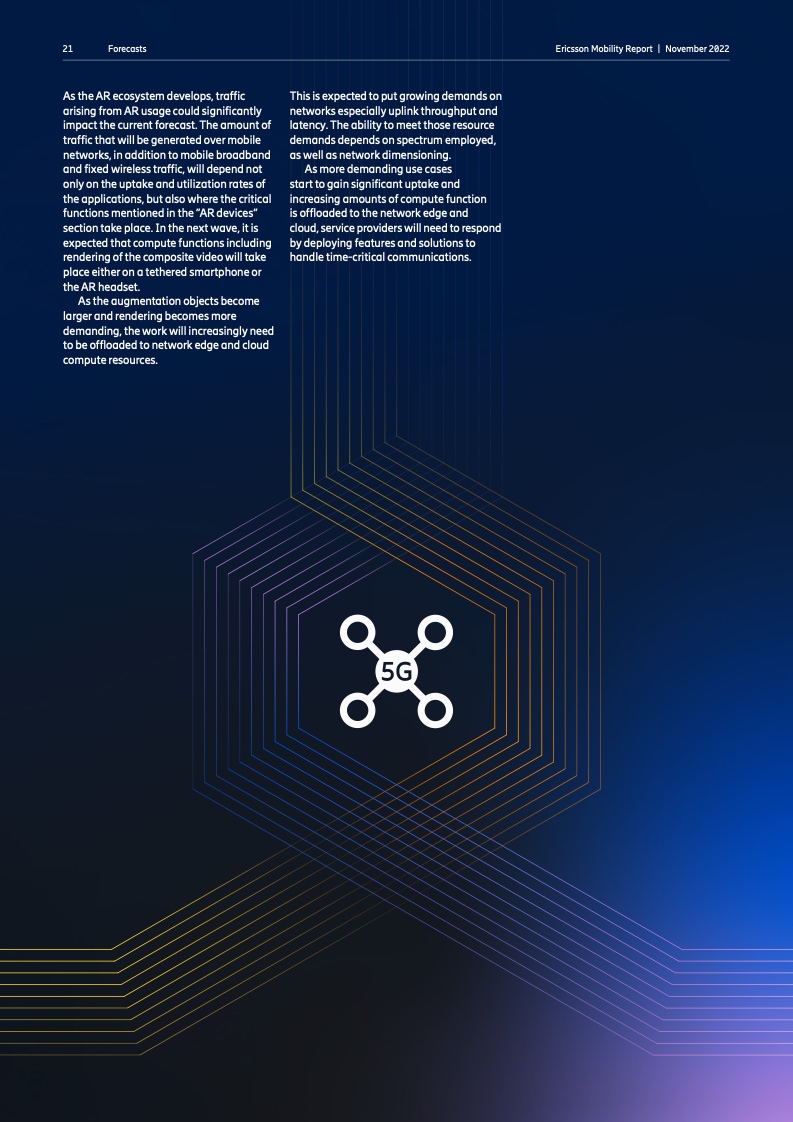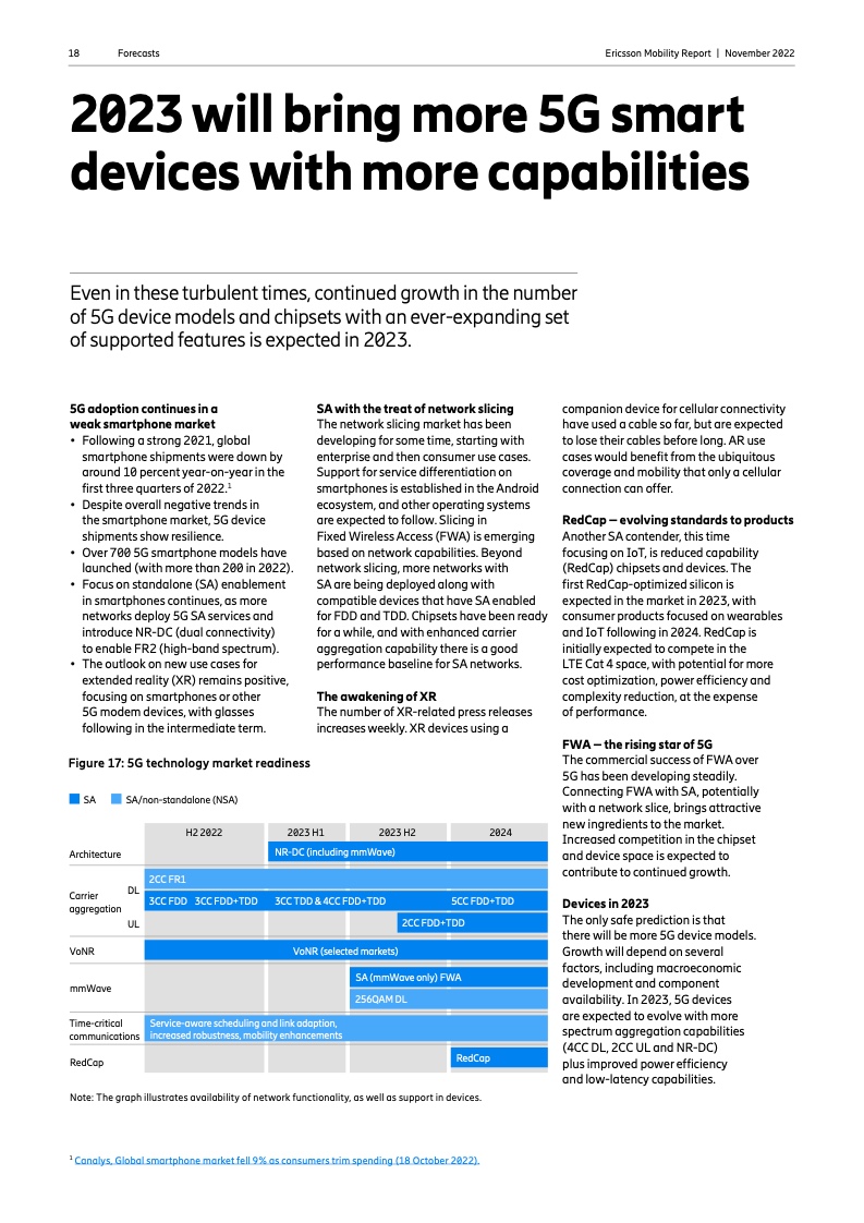 到 2022 年底,全球5G 用户预计将达到 10 亿人。2023 年市场将推出更多具有附加功能的智能 5G 设备。对 2028 年的展望是 5G 用户将超过 50 亿人,固定无线接入(FWA)连接数将达到 3 亿个,其中 5G 将占 FWA 连接的近 80%。