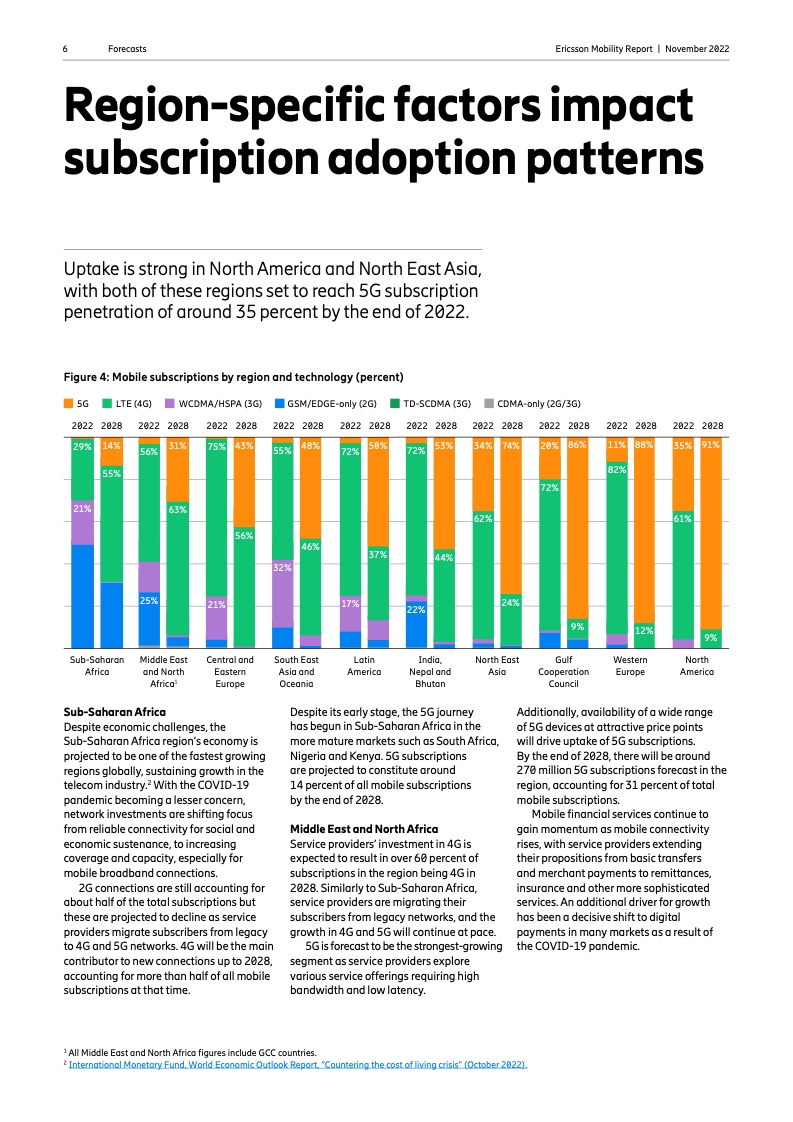 5G 用户在第三季度增长了 1.1 亿人,达到约 8.7 亿人,到 2022 年底,这一数字预计将达到 10 亿人。预计到 2022 年底,北美和东北亚的 5G 用户渗透率最高将占35%,其次是海湾合作委员会国家(20%)和西欧(11%)。到 2028 年,预计北美的 5G 普及率将达到 91%,其次是西欧(88%)。