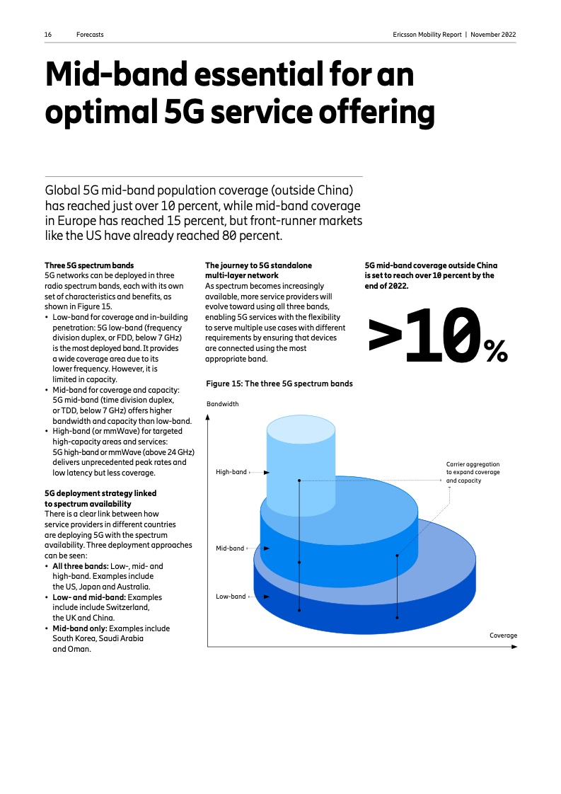放眼全球,5G 在所有地区都已普及,但服务提供商推出的方式各不相同,这取决于许多当地因素。例如,5G 中频人口覆盖对于提供最佳 5G 服务和用户体验至关重要,但在不同市场的部署速度各不相同。它在全球的人口覆盖率已达到 25%,但美国等领先市场已达到 80%。