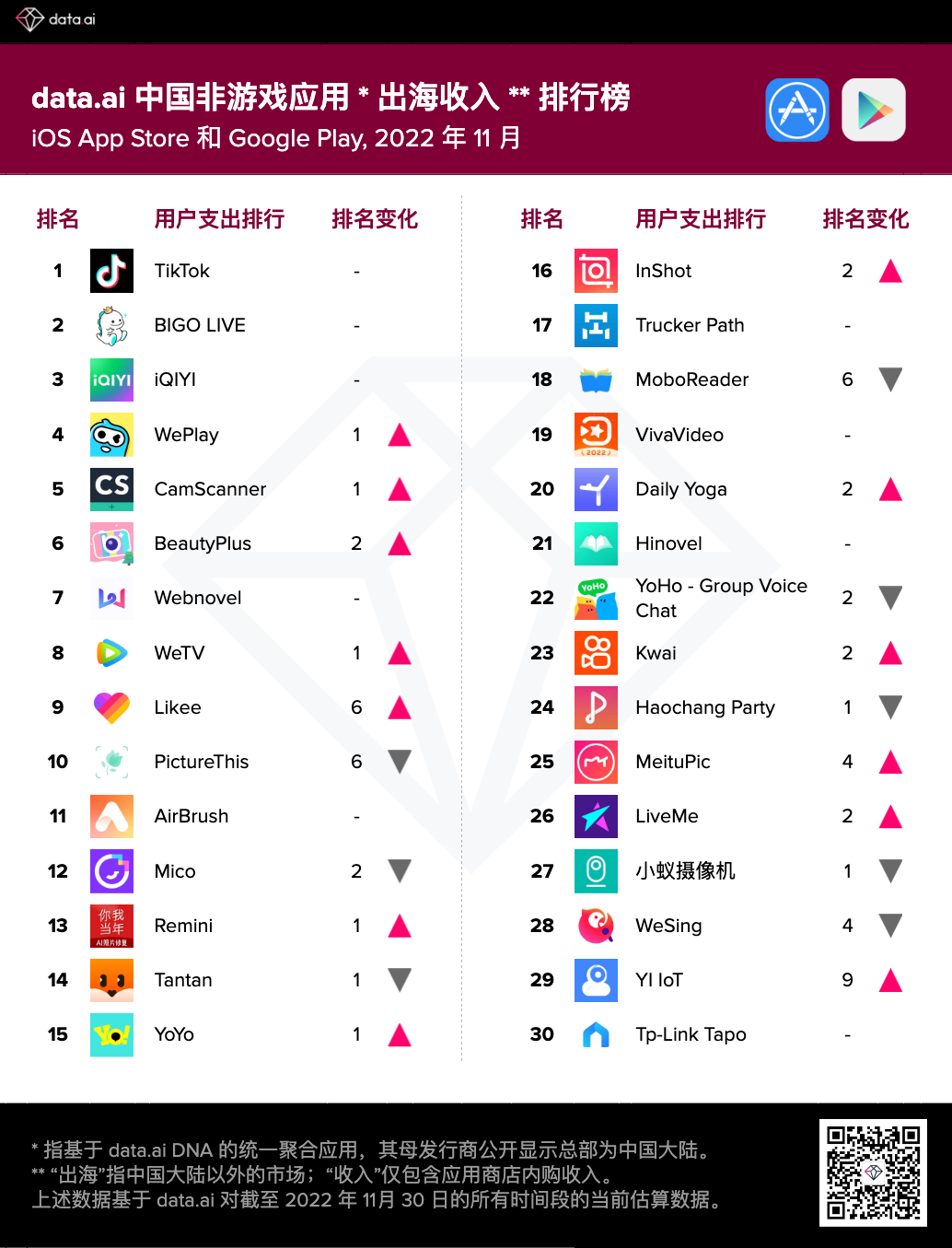 11月中国非游戏厂商及应用出海收入排行榜出炉,非游戏厂商收入榜单前三名(按排名先后顺序)为字节跳动、欢聚集团、腾讯,相比十月排名无变化。在头部榜单位置,美图排名前进1名,夺得第四。爱奇艺继续保持上升趋势,前进1名,获得第五。爱奇艺在许多东南亚国家都有增长,根据data.ai的估算数据,收入方面,泰国是目前爱奇艺除中国以外的最大市场。2022年年初它在泰国的iOS&Google非游戏类应用收入排名中仅为第八,而截止2022年11月30日,它的排名已是继Youtube、TikTok和LINE之后的第四位。赤子城科技排名上升至第九。赤子城科技于2021年下半年推出新社交聊天平台《SUGO:Random Chat, Make Friends 》,该应用已在中东和南亚市场取得重大进展,如沙特阿拉伯、埃及和印度。2022年11月,其全球收入同比增长660%以上。
