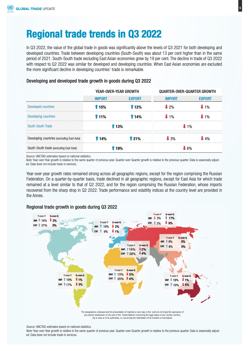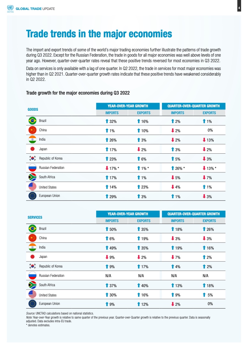 不过,贸易额的增长从今年下半年开始已经放缓,今年三季度的商品贸易额环比下降了1个百分点左右。尽管三季度的服务贸易额环比增长了约1.3%,但贸发会议预计,到四季度商品和服务的贸易额增长将双双下滑。