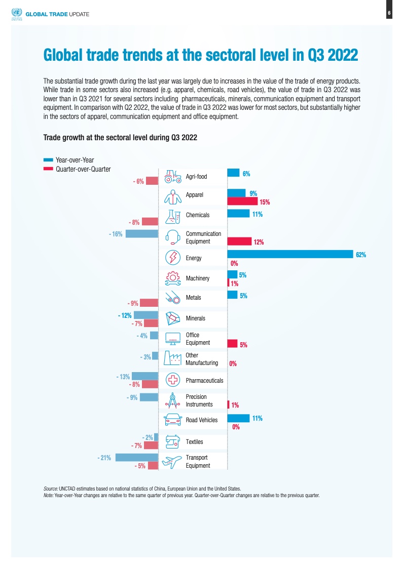 贸发会议同时指出,全球贸易体量实际上在2022年全年保持增长,这体现出全球贸易需求的坚挺。之所以贸易额会在下半年减少,其部分原因是由于初级产品价格、尤其是能源价格的下降。