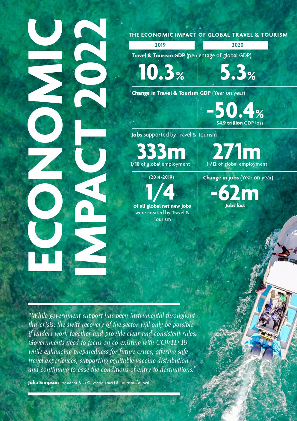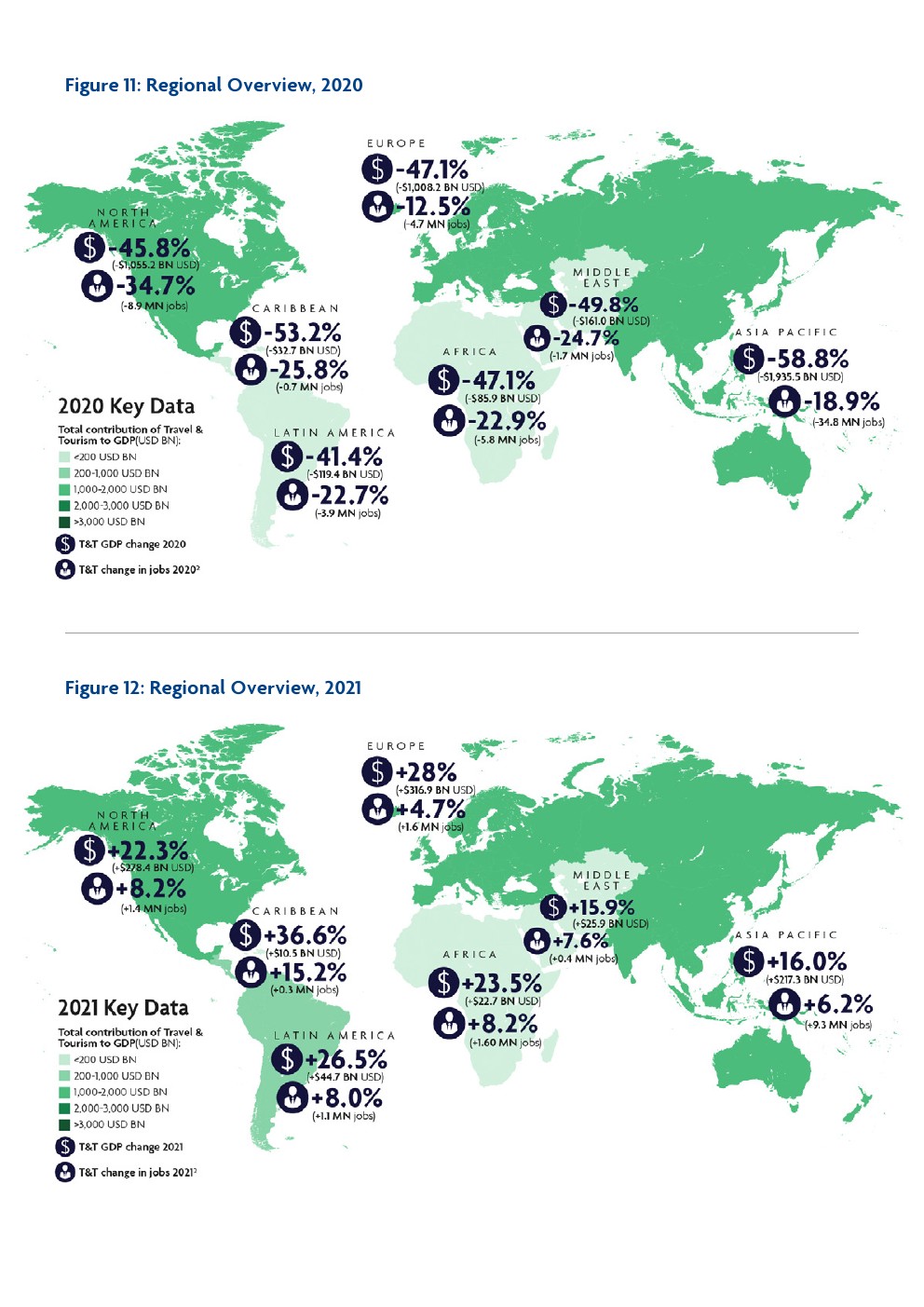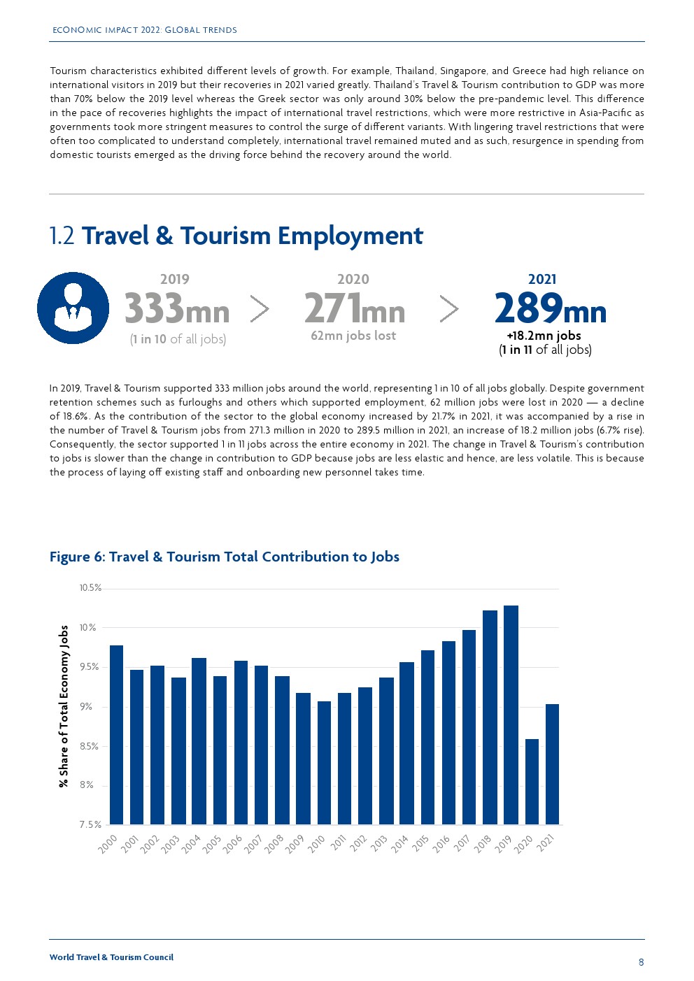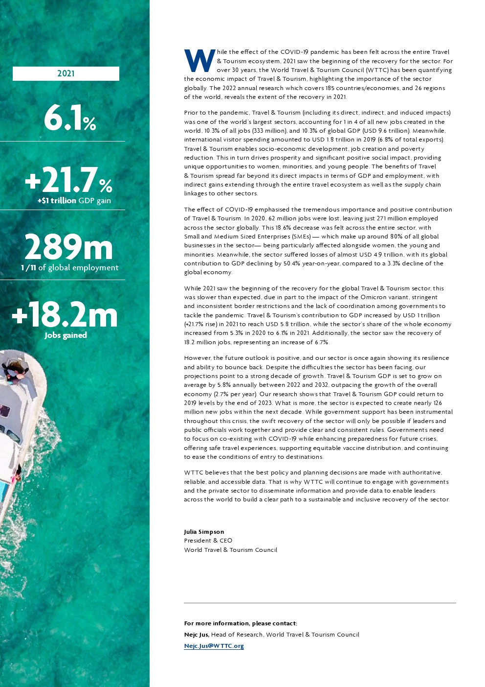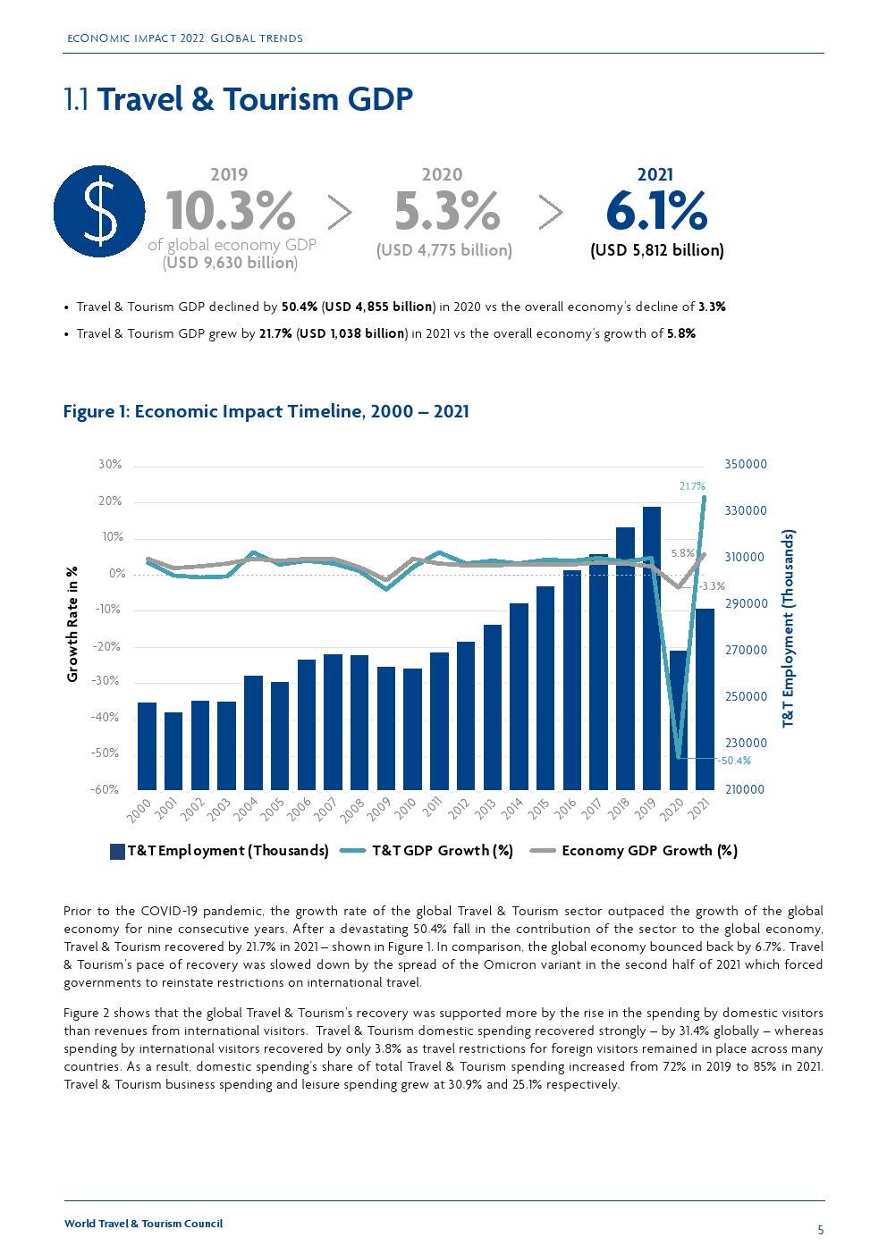 虽然 2021 年全球旅游业开始复苏,但速度低于预期,部分原因是 Omicron 变体的影响、严格且不一致的边境限制以及政府之间缺乏应对这一流行病的协调性。 旅游业对 GDP 的贡献在 2021 年增长了 1 万亿美元(+21.7%),达到 5.8 万亿美元,而该行业在整个经济中的份额从 2020 年的 5.3%增长到 2021 年的 6.1%。此外,该行业恢复就业岗位1820万个,同比增长6.7%。