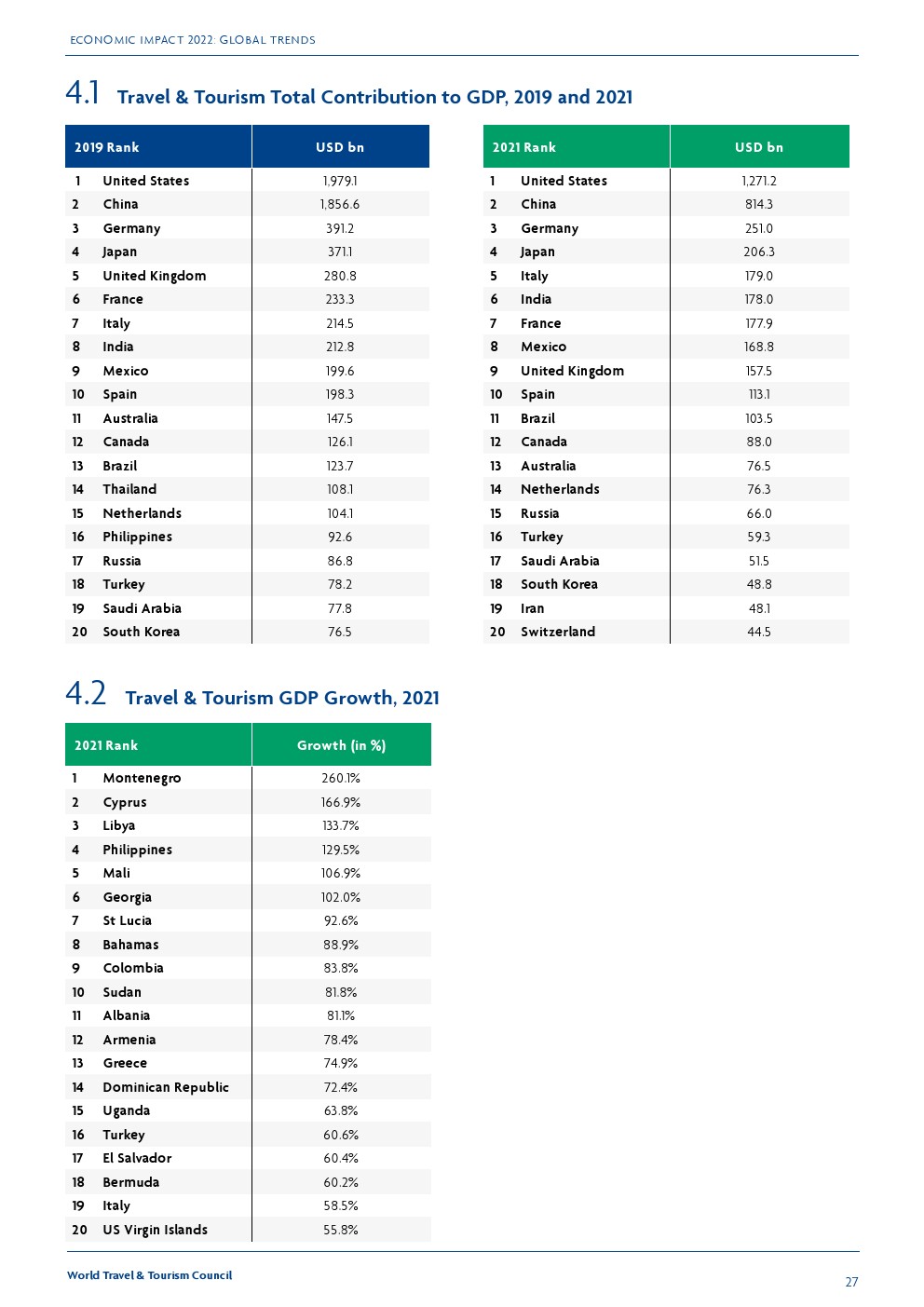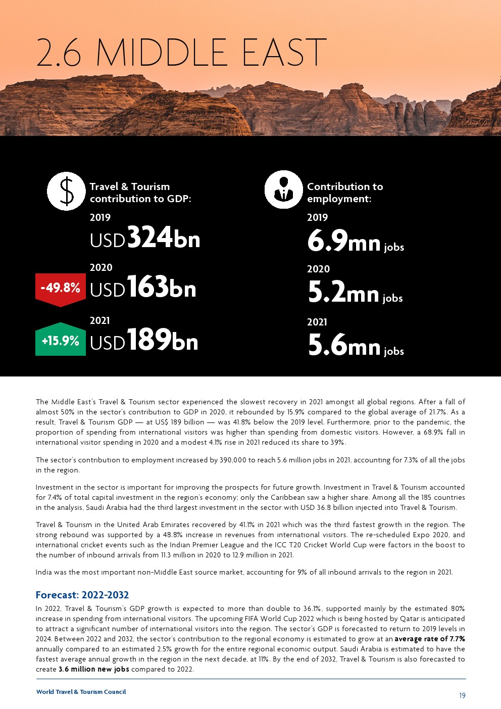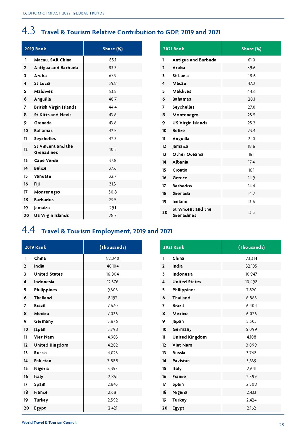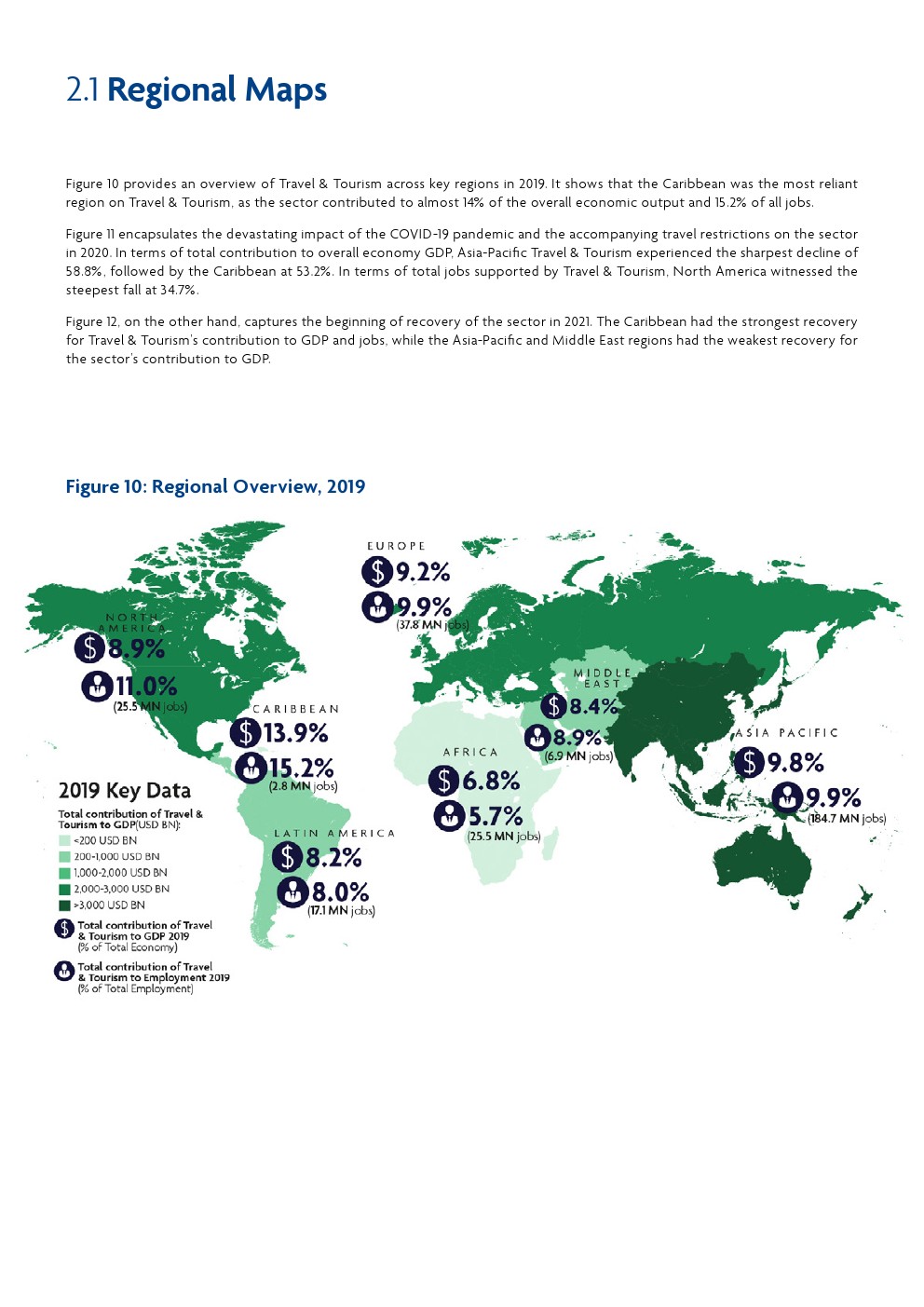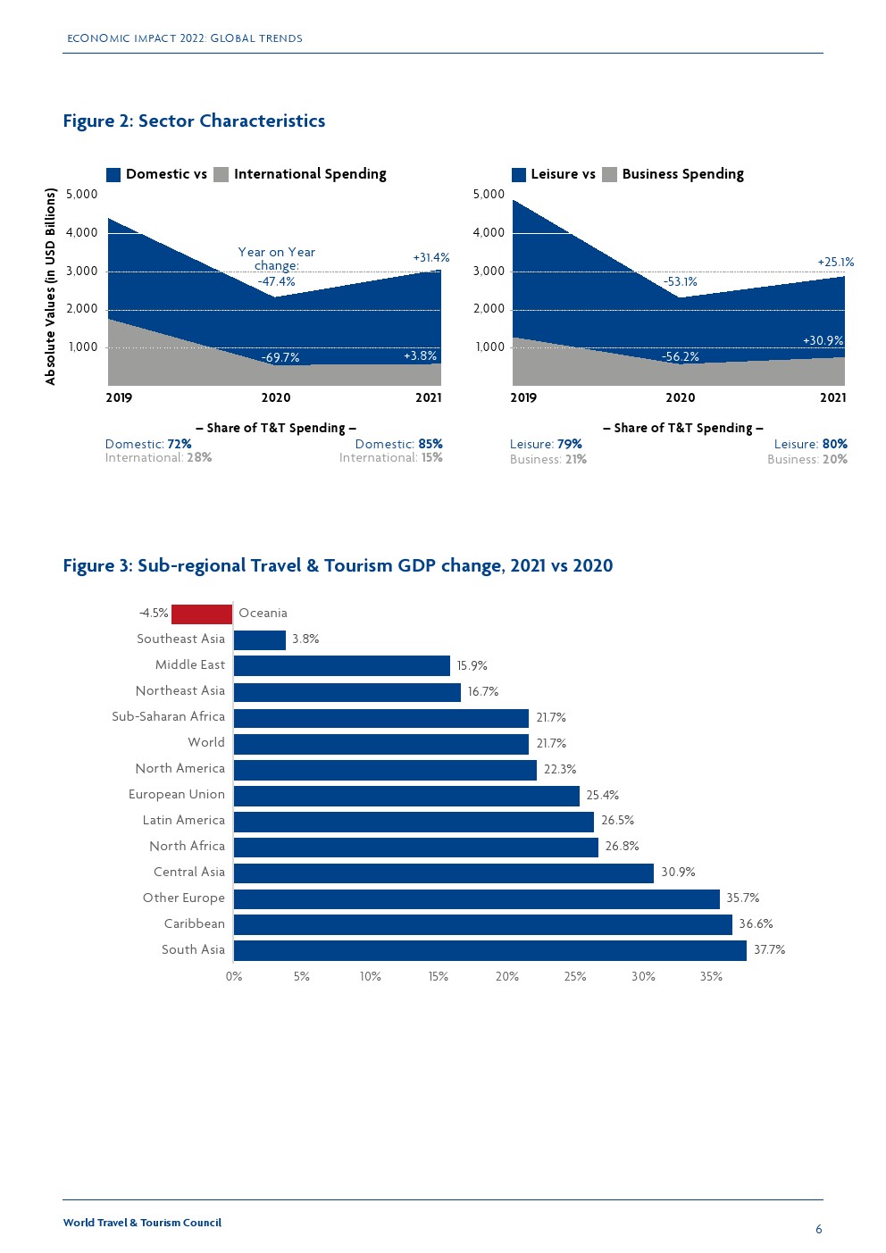 虽然 2021 年全球旅游业开始复苏,但速度低于预期,部分原因是 Omicron 变体的影响、严格且不一致的边境限制以及政府之间缺乏应对这一流行病的协调性。 旅游业对 GDP 的贡献在 2021 年增长了 1 万亿美元(+21.7%),达到 5.8 万亿美元,而该行业在整个经济中的份额从 2020 年的 5.3%增长到 2021 年的 6.1%。此外,该行业恢复就业岗位1820万个,同比增长6.7%。